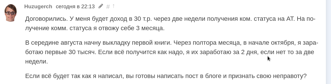 Если это случится, то начинающий автор будет прав, а я - соответственно, нетЪ. Тогда я через год после начала эксперимента куплю его книжку из первых опуликованных и подведу итоги наблюдений.