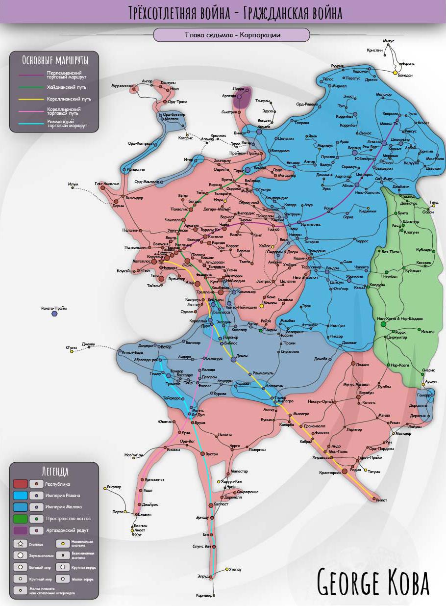 Автор: George KobaКарта для книги наконец-то закончена! На неё ушло гораздо больше времени, чем я ожидал. Пришлось изучить почти все планеты в Галактике, из которых я кропотливо выбирал те, что могли существовать в 4000 годах ДБЯ.