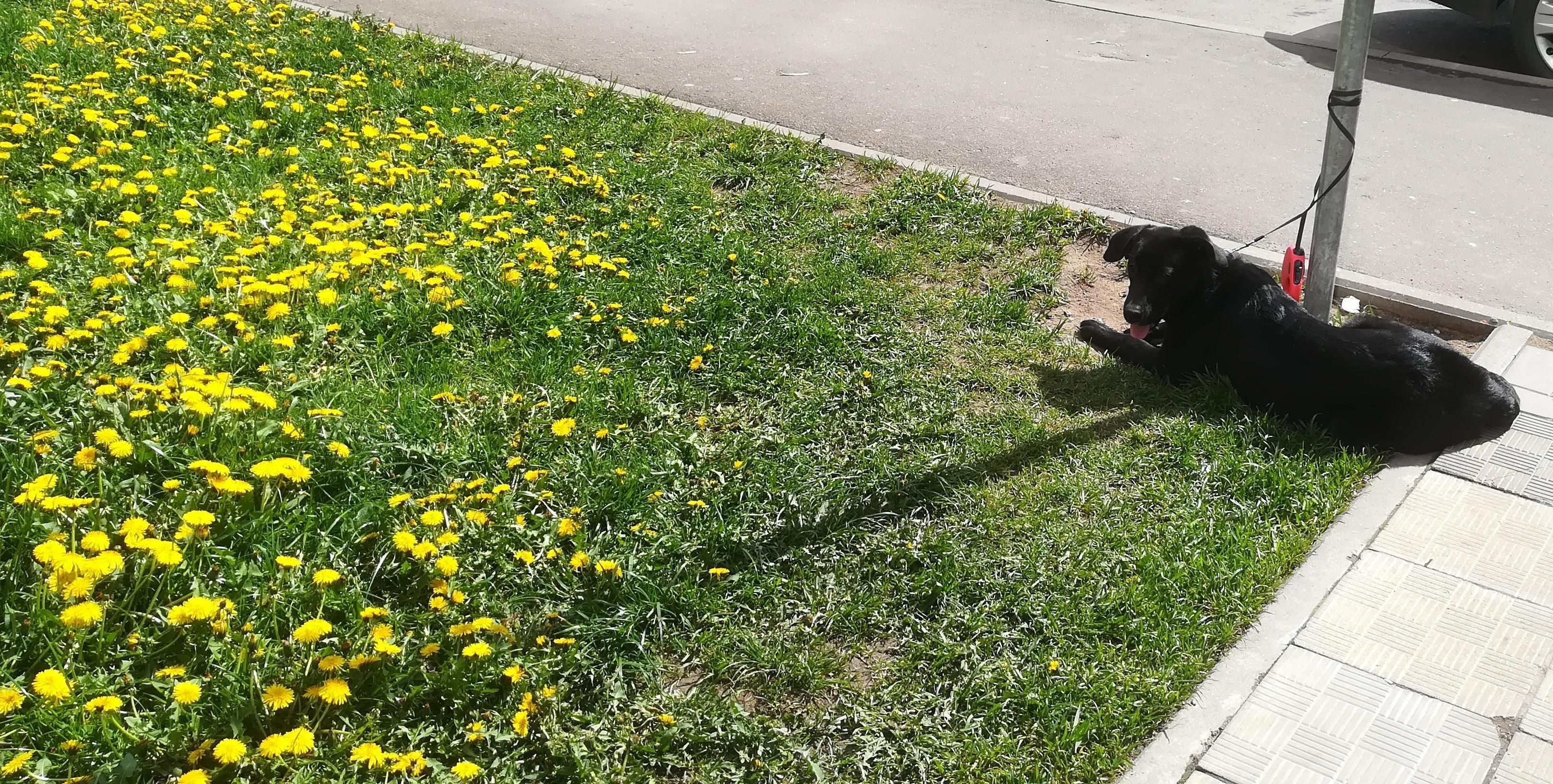 Собака и одуванчиковое поле)) очень славная черненькая фоткаться не хотела отворачивалась)