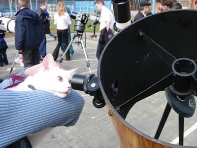 На фото моя кошка Батарейка на Астрофесте-2002. (Да, конвенты есть не только у любителей фантастики.) Что она может рассмотреть в окуляр телескопа днем -- загадка. Но смотрит.
