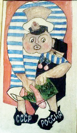 В правой руке бывший советский офицер держит мужской половой орган, который он положил на ту присягу, в которой клялся защищать свою страну СССР и весь советский народ до последней капли крови.
