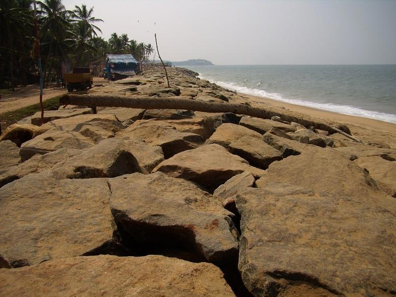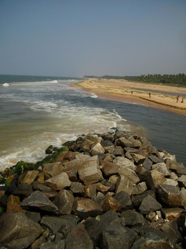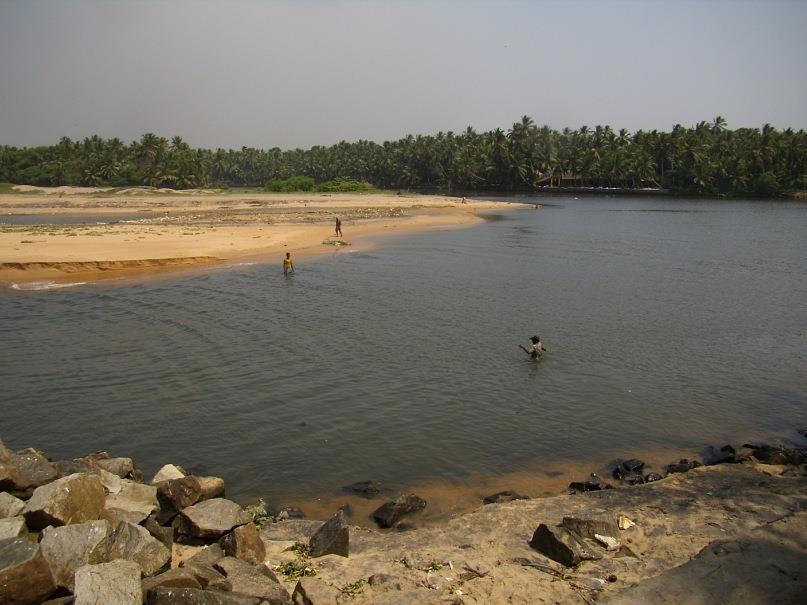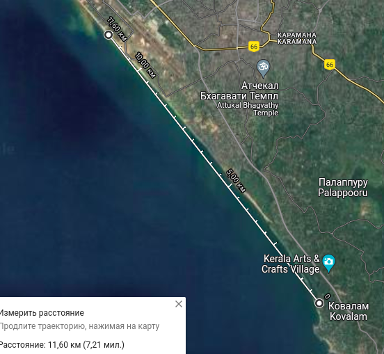 На карте можно увидеть, что от Ковалама до аэропорта Тривандрума не очень далеко, примерно 12 километров, почти по прямой линии и вдоль берега песок и пальмы. Есть, правда какая-то речушка, впадающая в море. Можно прогуляться пешочком до аэропорта, оттуда на автобусе доехать до города, потусить в нём, и затем, на рикше или такси, вернуться назад, в Ковалам. Очень уж мне хотелось воплотить в реальность эту красивую картинку: я иду босиком по индийскому побережью, с рюкзачком за спиной, по тем самым местам, где разворачивались драматические события, описанные в Рамаяне: великое обезьяноподобное божество Хануман, предводитель войска ванаров, идет войной на остров Шри-Ланка, где обитает коварный и могущественный демон Равана похитивший девушку Ситу, возлюбленную Рамы.