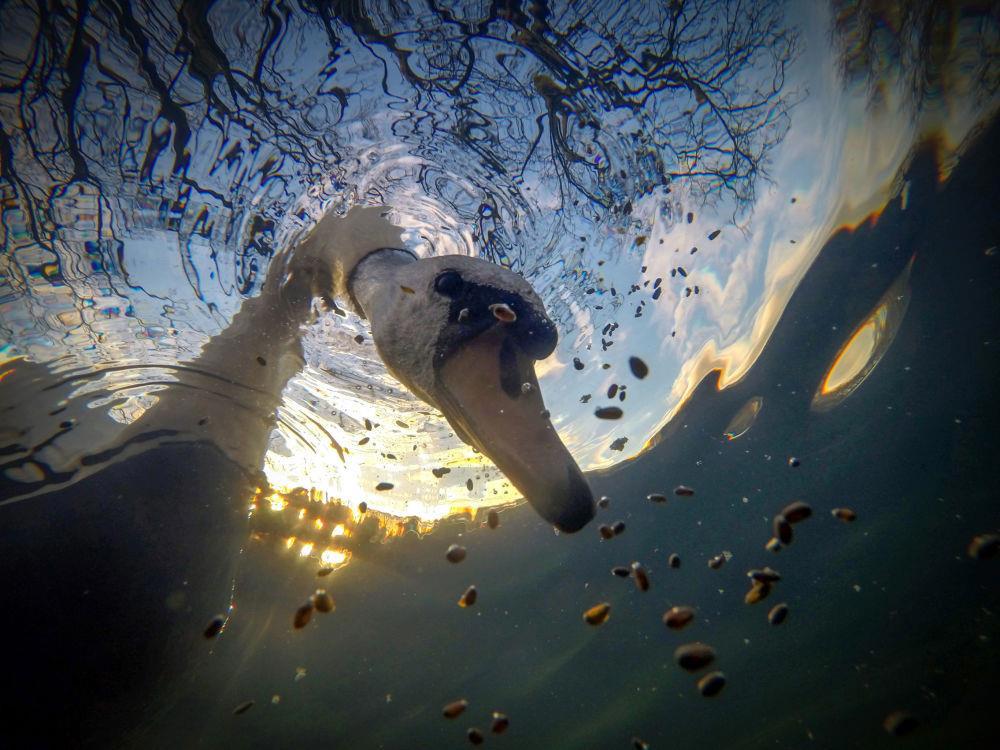 Непрозрачный гусь ищет добычу в прозрачной воде. :)