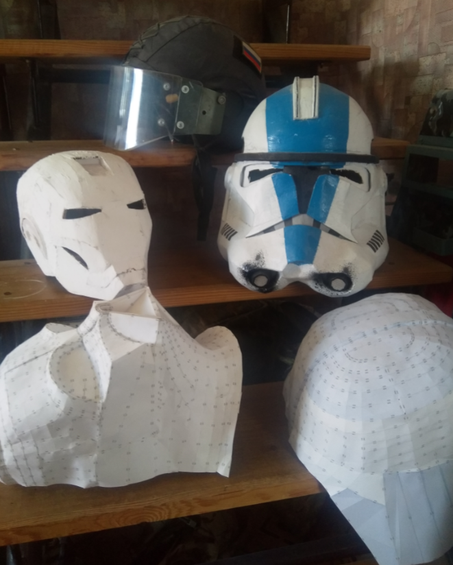ЗШ - готовый, забрало заказать пришлось, стекло из бумаги фиг сделаешь. На шлем штурмовика визор жду, ну и ЖелЧел и Вейдер на стадии изготовления.