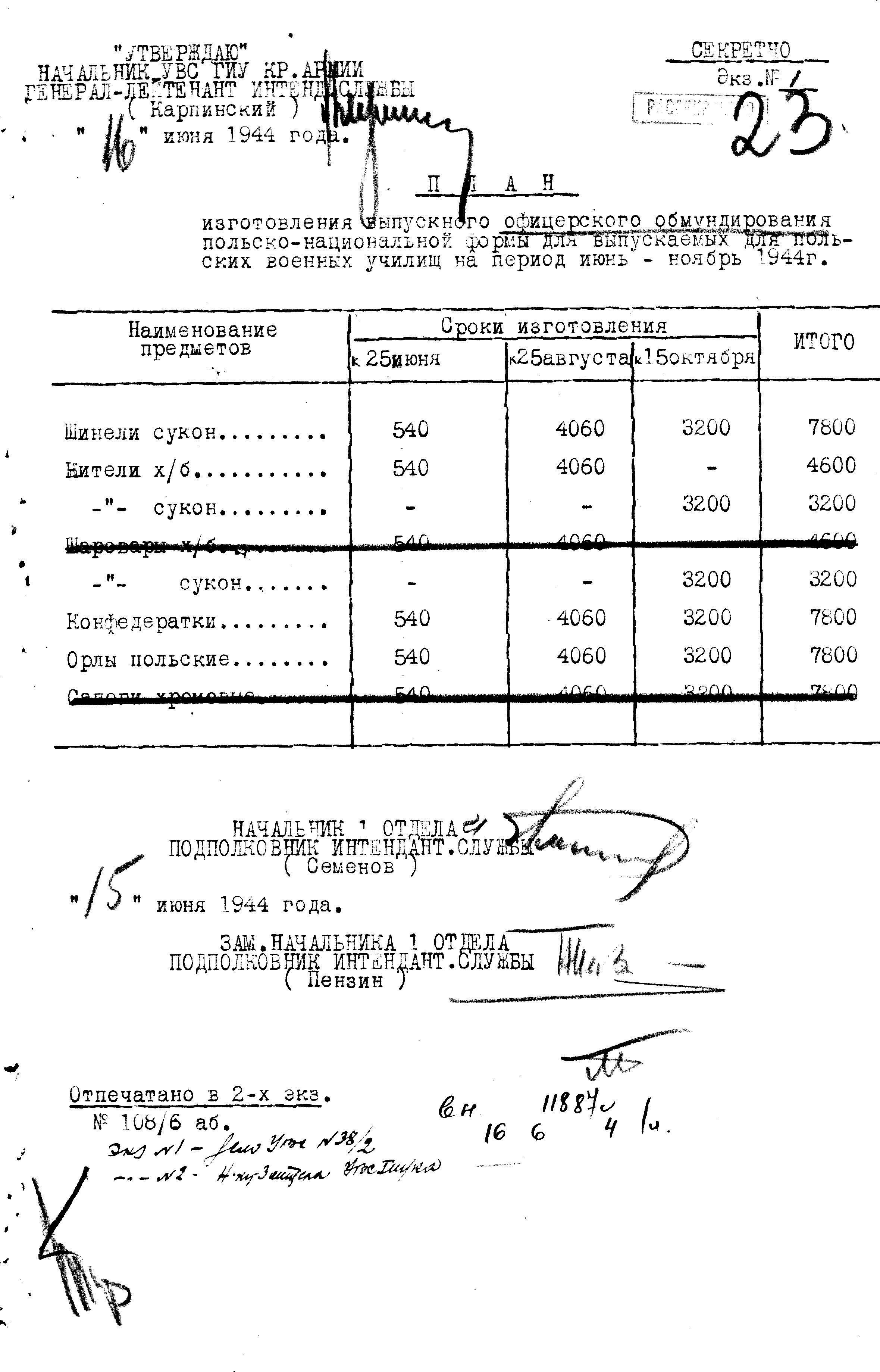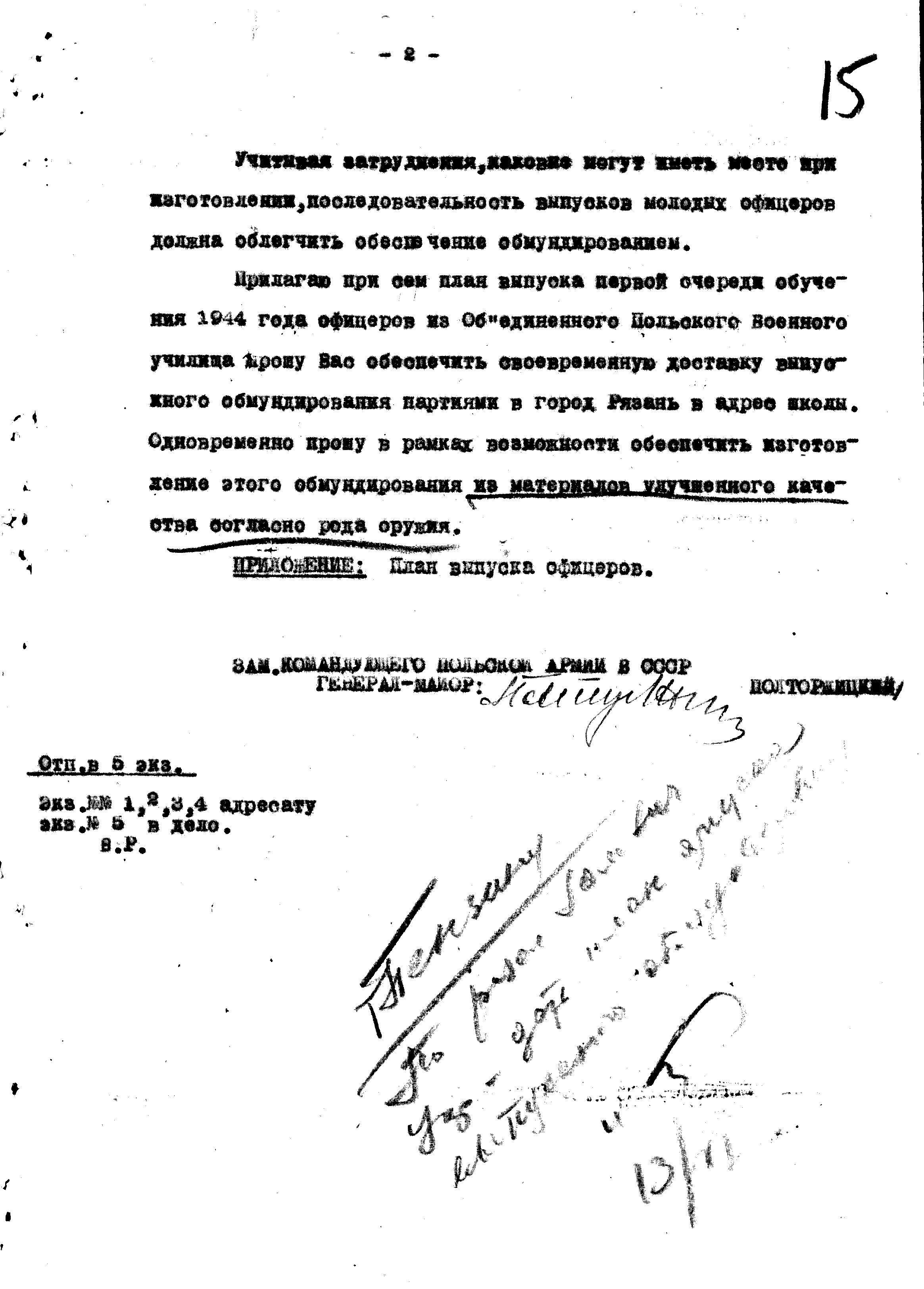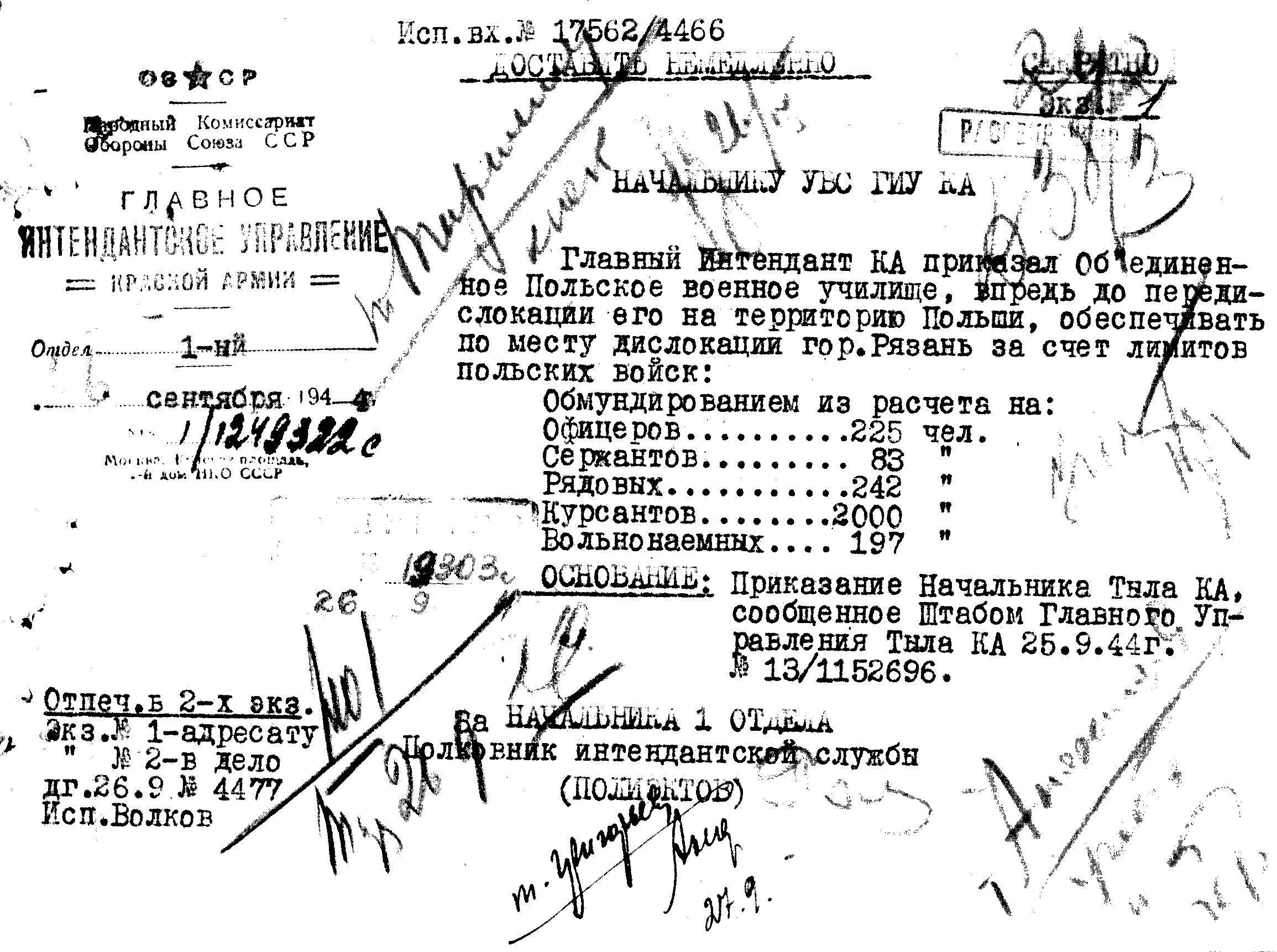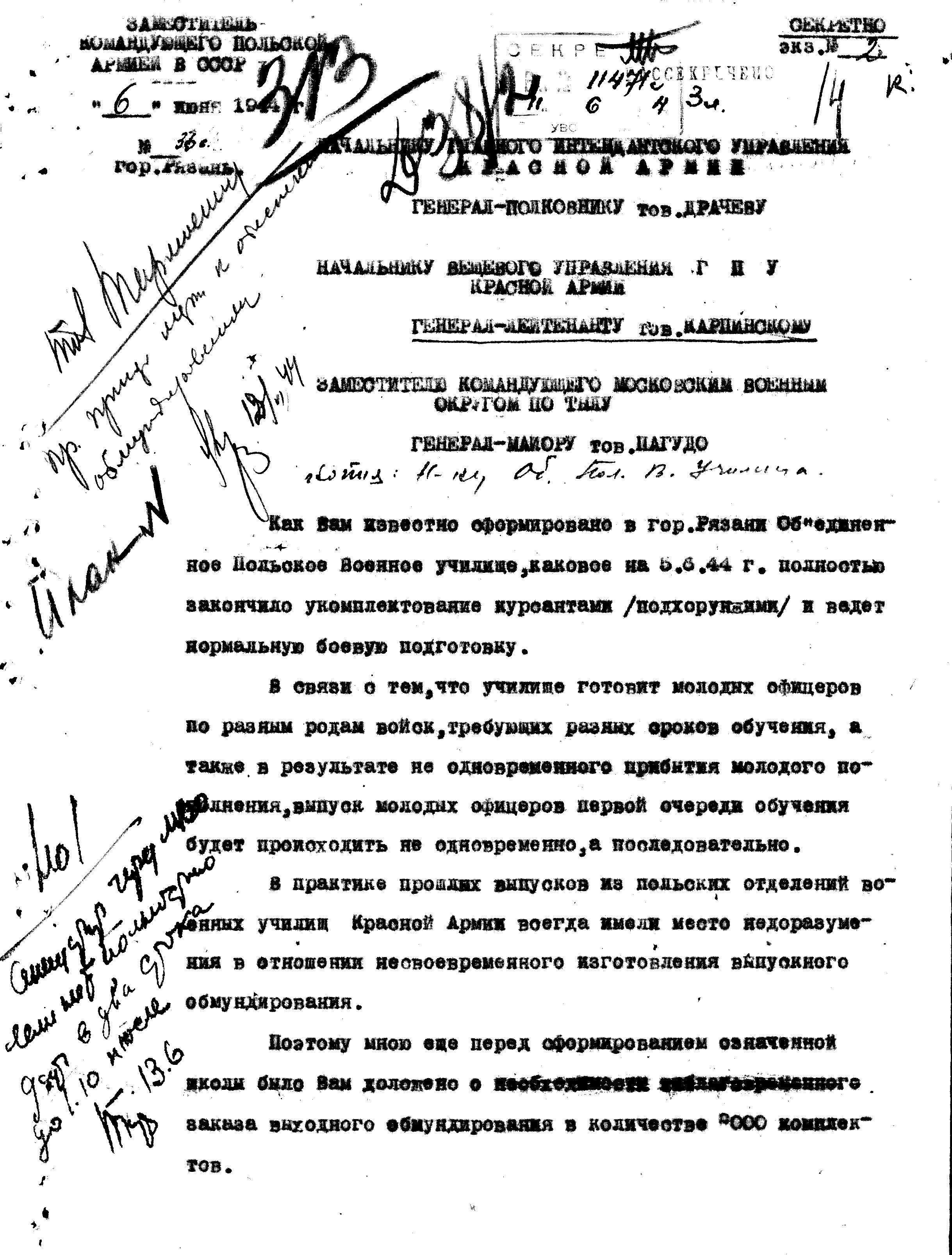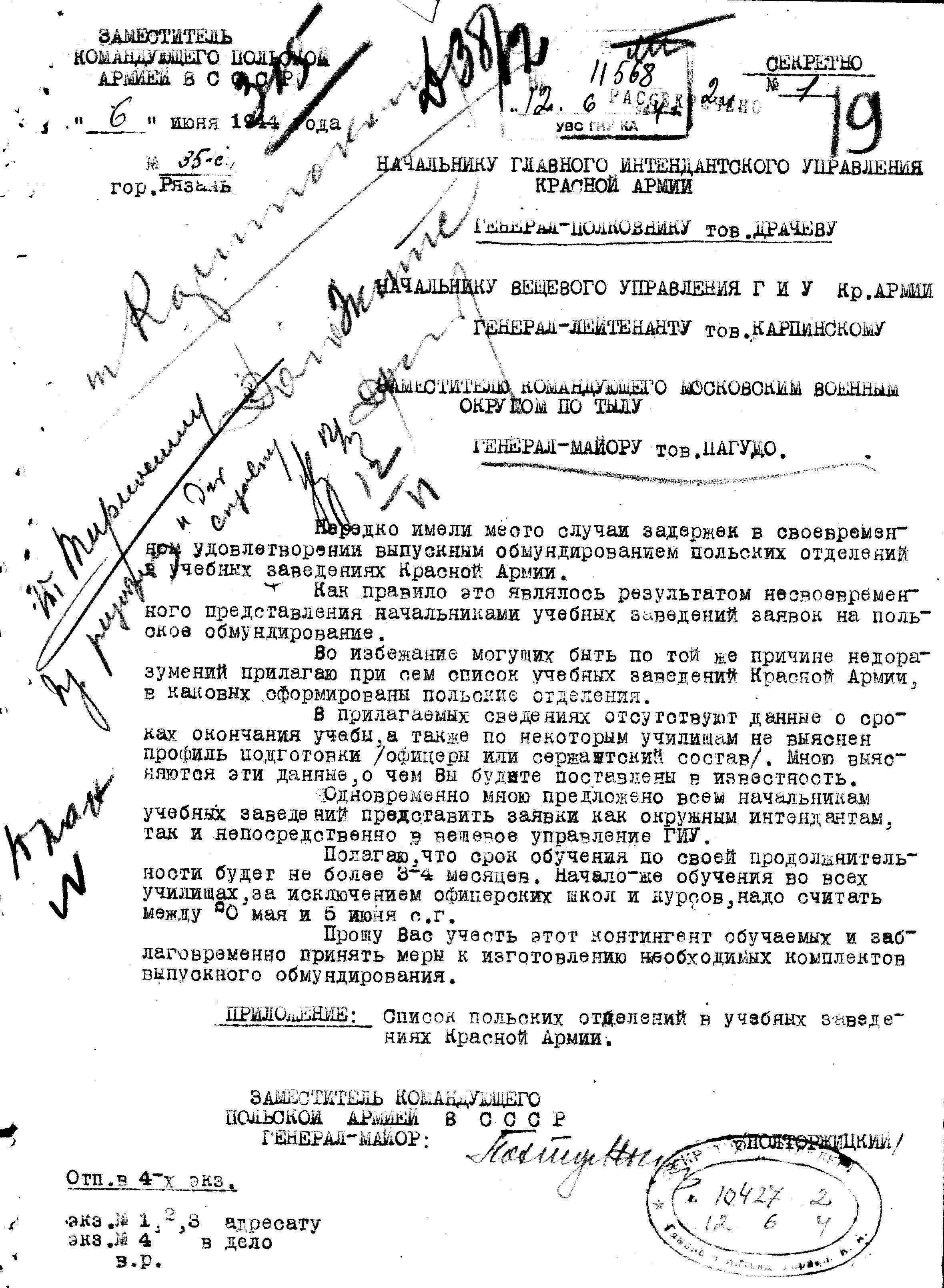 Как видно из письма, подготовка польских офицеров велась в советских военных училищах и ранее, но со своевременным и полным обеспечением выпускников были определенные проблемы. И дело тут не столько в низкой распорядительности интендантов. Как справедливо отмечено в письме, командование училищ не всегда своевременно подавало заявки на поставку необходимого обмундирования.