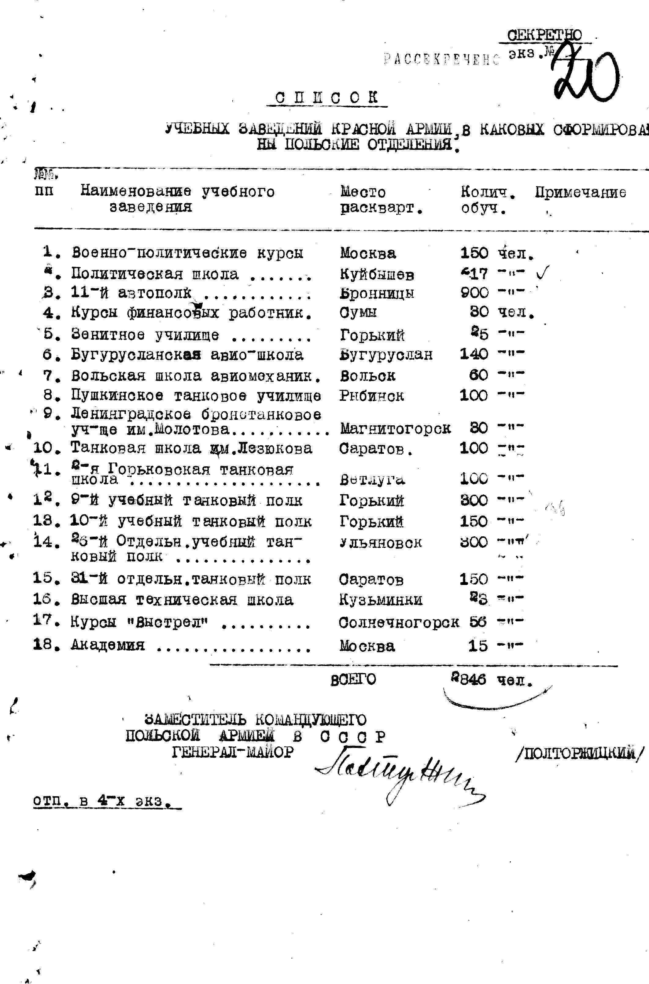 Несколько раз попадалось утверждение, якобы командный состав Польской армии (Войска Польского) комплектовался советскими сержантами и командирами. Не знаю, чем руководствовались исследователи, делавшие подобные заявления, как видно из документов, кадры для армии готовились заблаговременно и из числа поляков.