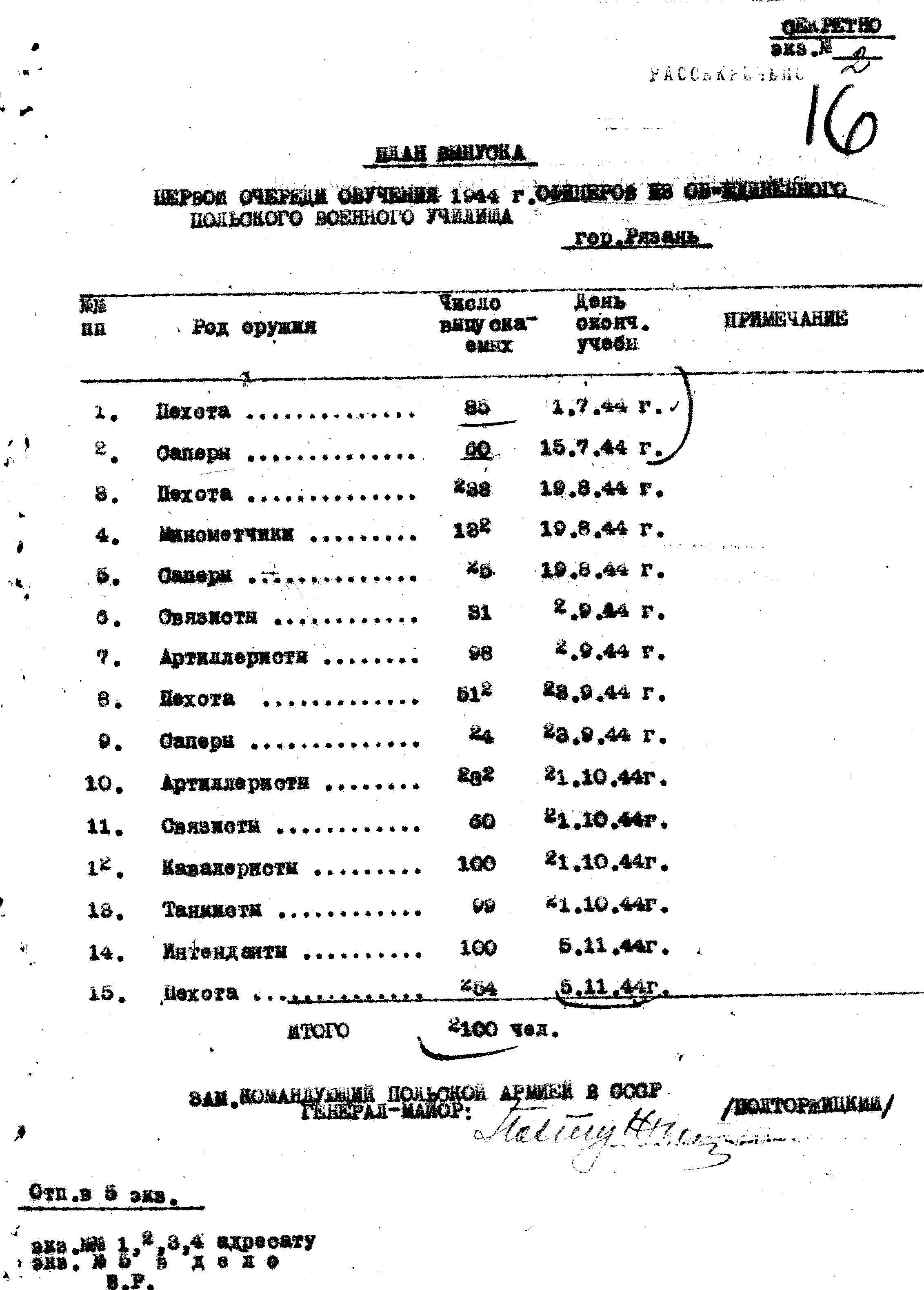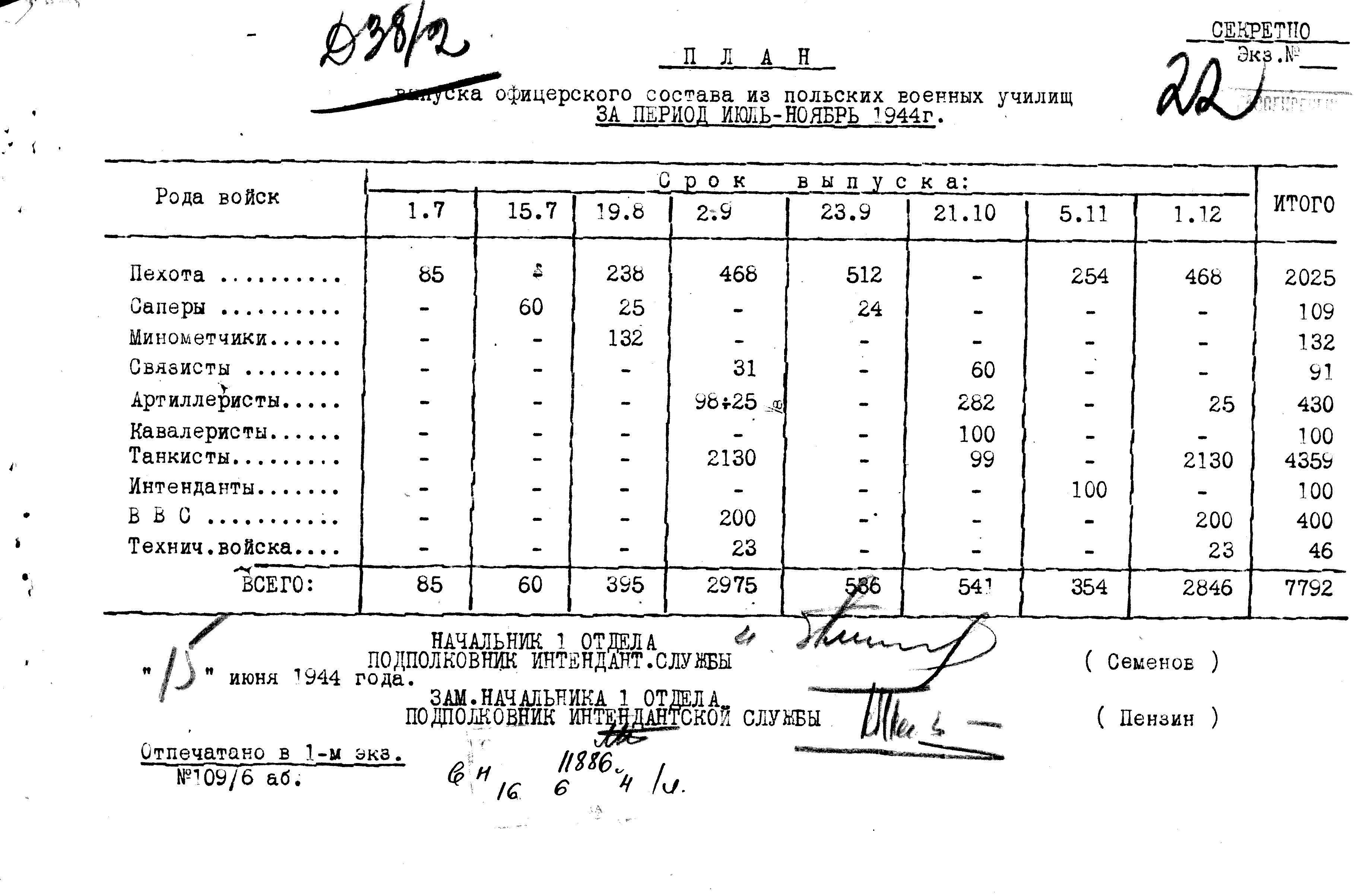 д/с: План выпуска офицерского состава из польских военных училищ за период июль – ноябрь 1944 г.![]()