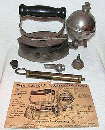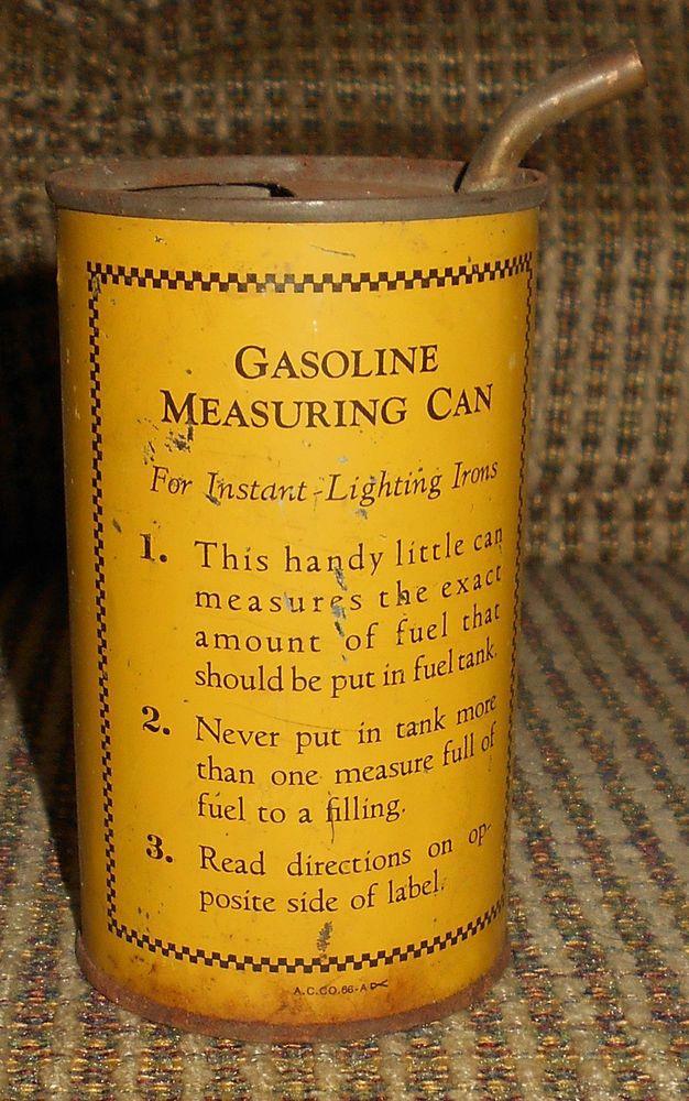 А раньше топливом для утюгов был белый бензин Amoco. Почему именно белый газ? Ответ специалистов продававших и ремонтировавших эти утюги и печи — этилированный бензин засорил бы крошечные форсунки, а при надлежащем уходе они работали очень хорошо.