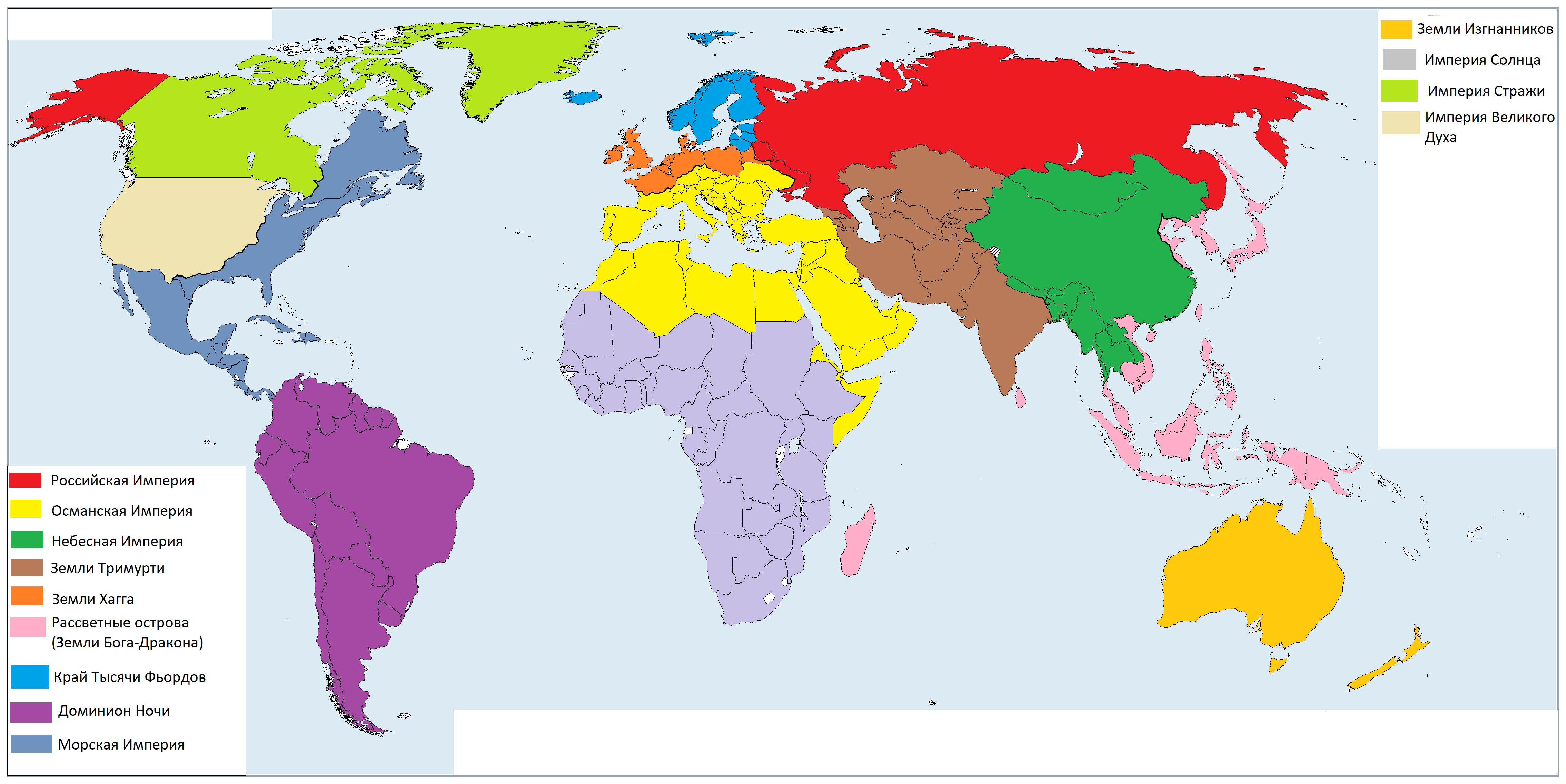 Хотя не все страны указанные тут принадлежат божественным императорам. Доминион Ночи например - подконтролен темным эльфам, пришедшим в этот мир гораздо позже. Хагга - это раса демонов из Инферно, возглавляемых одним из князей Инферно Хагготтом. Хагга были призваны Османской Империей для войны с Империей Севера, и в итоге последняя проиграла. Их божественный правитель, прозванный Одноглазым, был убит, а катаклизм расколол скандинавский полуостров на множество островков, отчего и пошло название Тысяча Фьордов. Ныне Тысяча Фьордов является протекторатом Российский Империи.