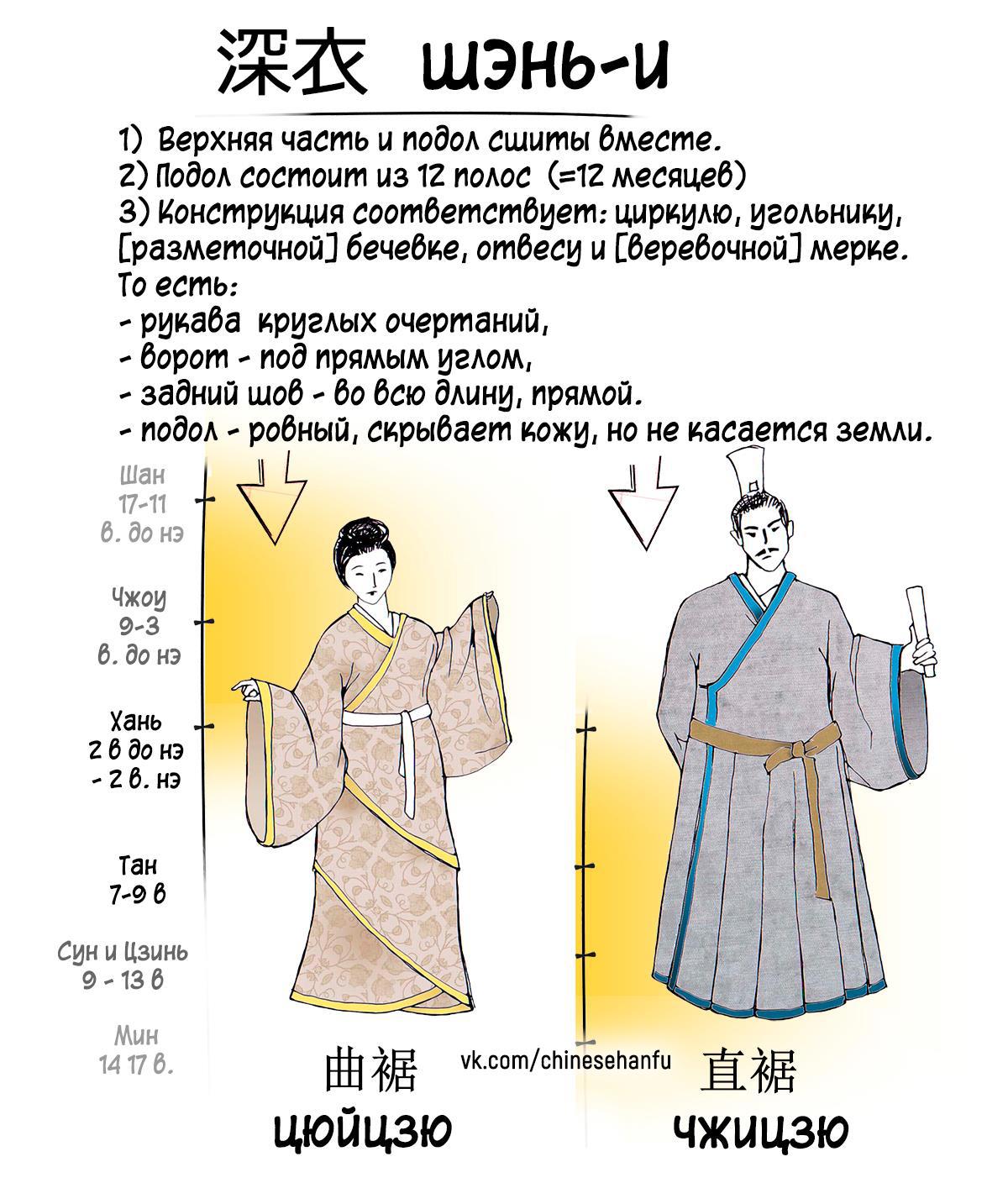 Канон 深衣 шэнь-и (шэн-и) (буквально: "глубокой одежды") начал формироваться в эпоху Шан (т.е. не позже 11 в до н.э.) и был записан в "Книге обрядов" ("Ли цзи") в конце эпохи Воюющих Царств - начале династии Хань (т.е. на рубеже 3-2 в. до н.э.):