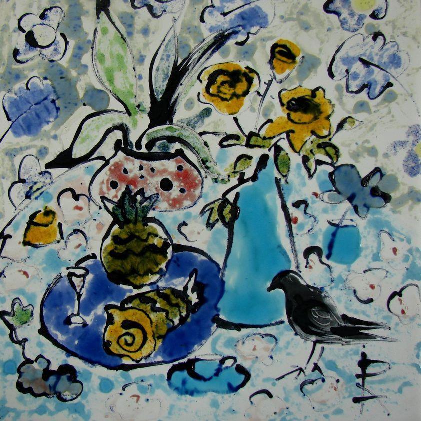 СВЕТЛЫЙ НАТЮРМОРТ С ЧЁРНОЙ ПТИЦЕЙ .