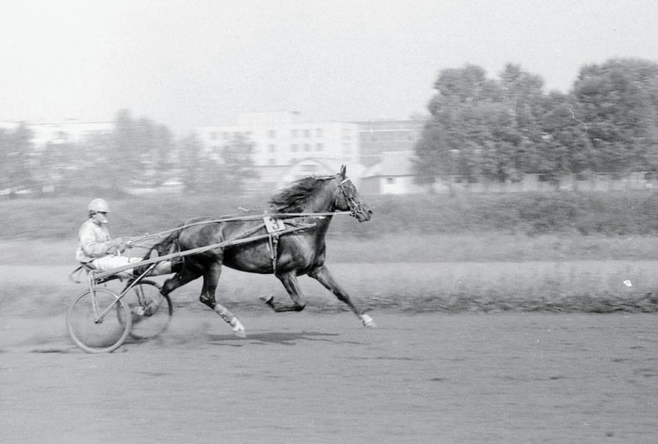 Тогда к ч.б. фото - мои эксперименты над фотографированием движения: рысак на Псковском ипподроме, момент "зависания", когда все 4 ноги лошади в воздухе. 1981 год.