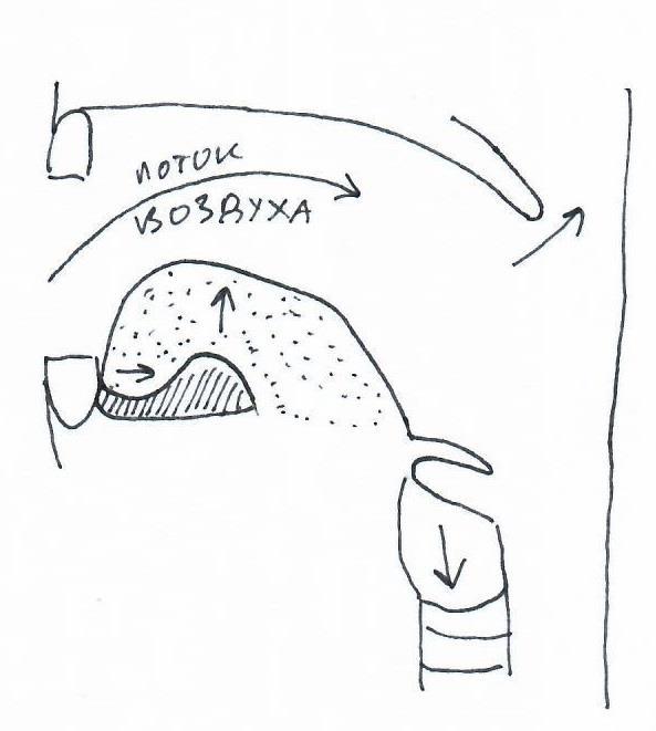 Чтобы согнуть поток воздуха, нам придется поработать языком и сделать глотку чуть шире и глубже. Вспоминаем наши ощущения во время добротного зевка: гортань опускается, мягкое небо чуть поднимается. То есть пространство за языком увеличивается. Нам необходимо научиться делать это самим на основании имеющихся ощущений. Однако этого мало. Подключаем язык: нам необходимо поднять его спинку, кончик между тем остается опущенным, хотя и сдвигается несколько назад. Чем ниже располагается отверстие, тем дальше от зубов мы отодвигаем его. При извлечении бенда на шестом отверстии, кончик языка остается на месте. Картинка в помощь.