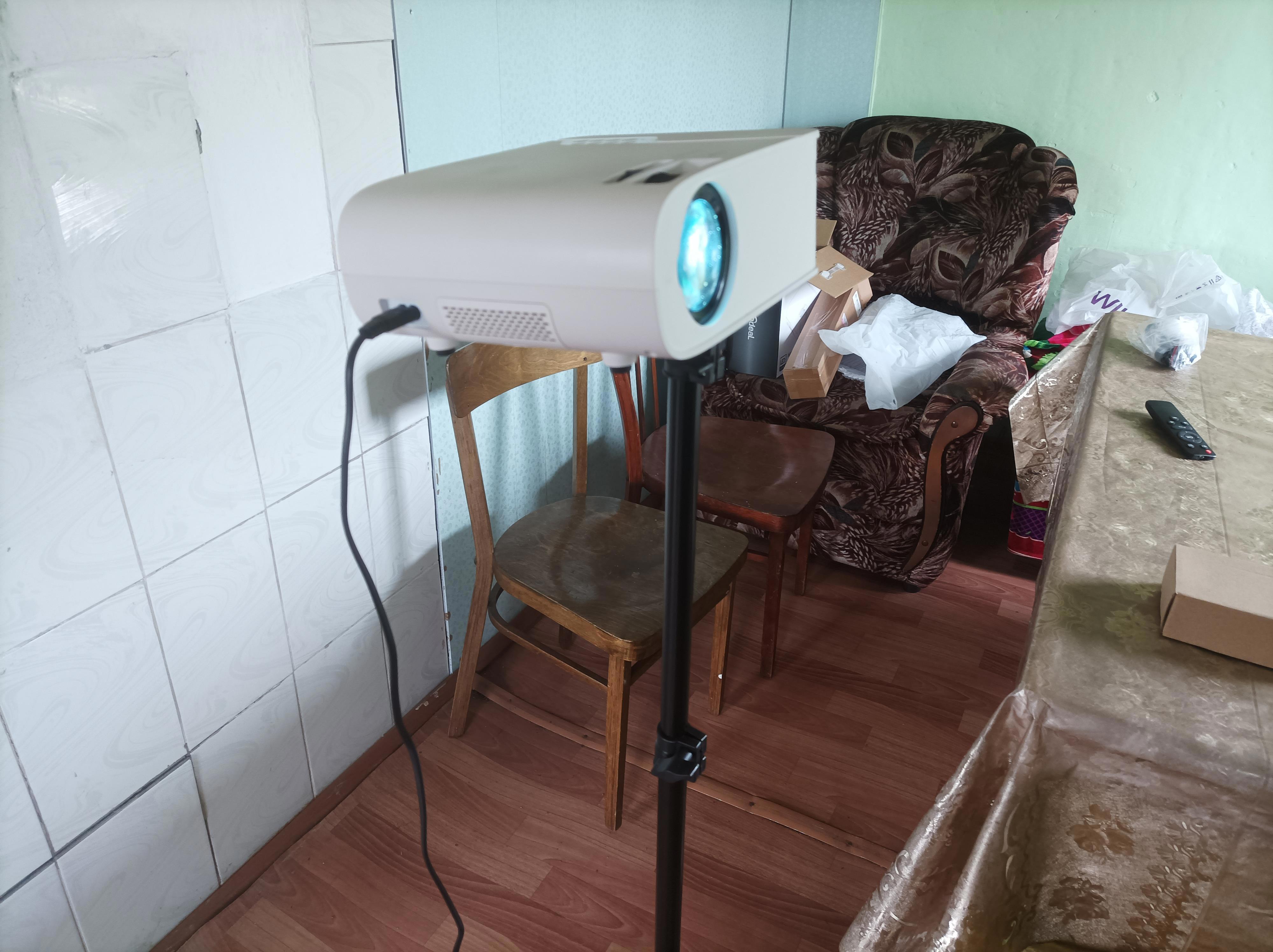 Автор: Дмитрий ФалеевСегодня пришёл мне в город в пункт сетевого магазина штатив для проектора. Он идеально подошёл для данного объекта. И сам проектор хорошо показывает - даже все окна открыты, а всё видно (но там тоже надо изображение не однотонное). Думал, понадобиться переходник. Но там было отверстие для болта (он регулирует положение проектора относительно горизонтали). Сейчас у меня полный боекомплект.