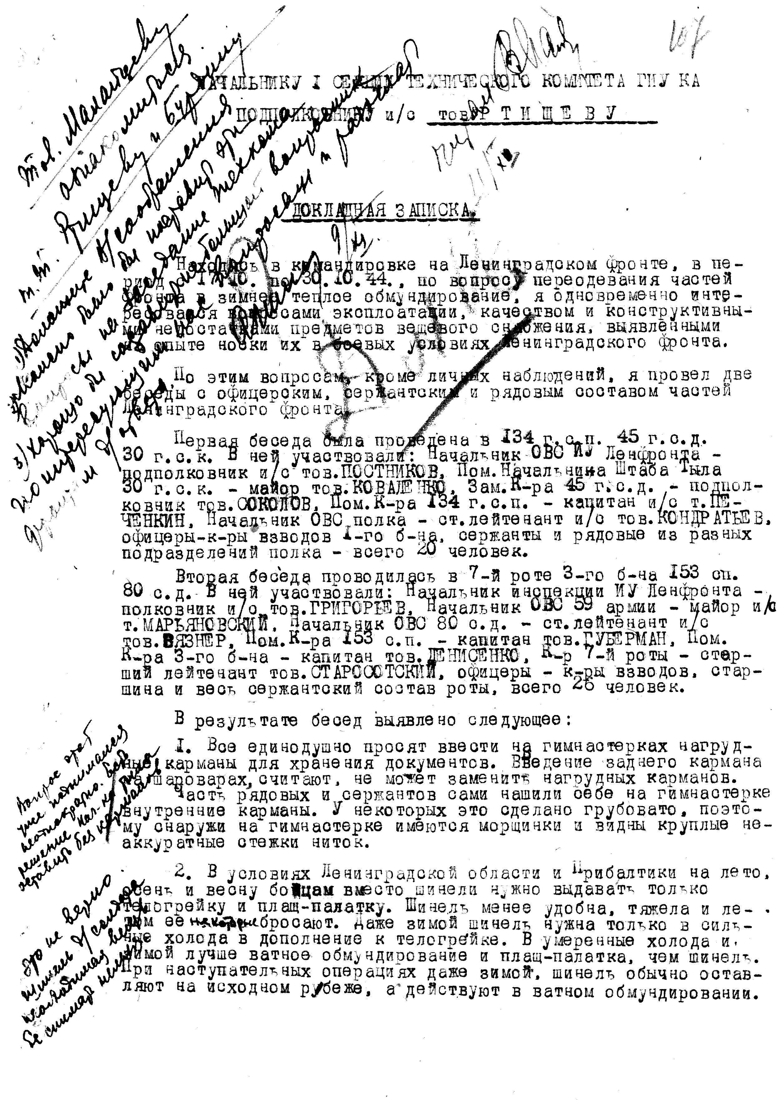 Одним из документов, рассказывающих о работе специалистов Техкома, является докладная записка подполковника и/с Бурдина, составленная по итогам командировки на Ленинградский фронт. Ввиду важности, доклад попал на стол Председателю Техкома генералу Агинскому, именно его резолюции Вы и можете прочитать на документе.