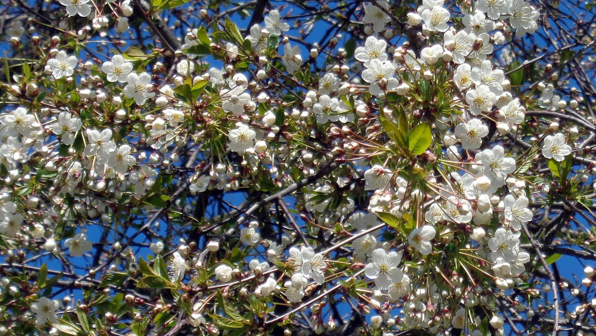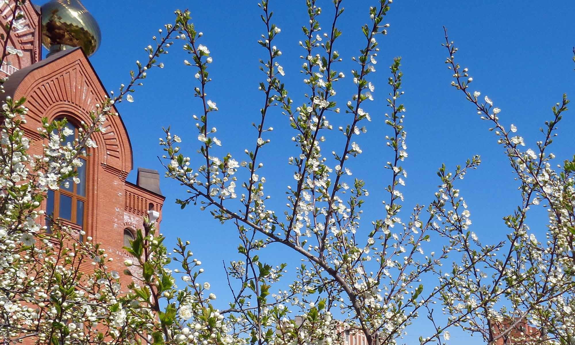 Наша прогулка к парку началась с улицы Добровольцев. Сейчас очень красивое время года, много цветущих деревьев. Вишни распускаются: