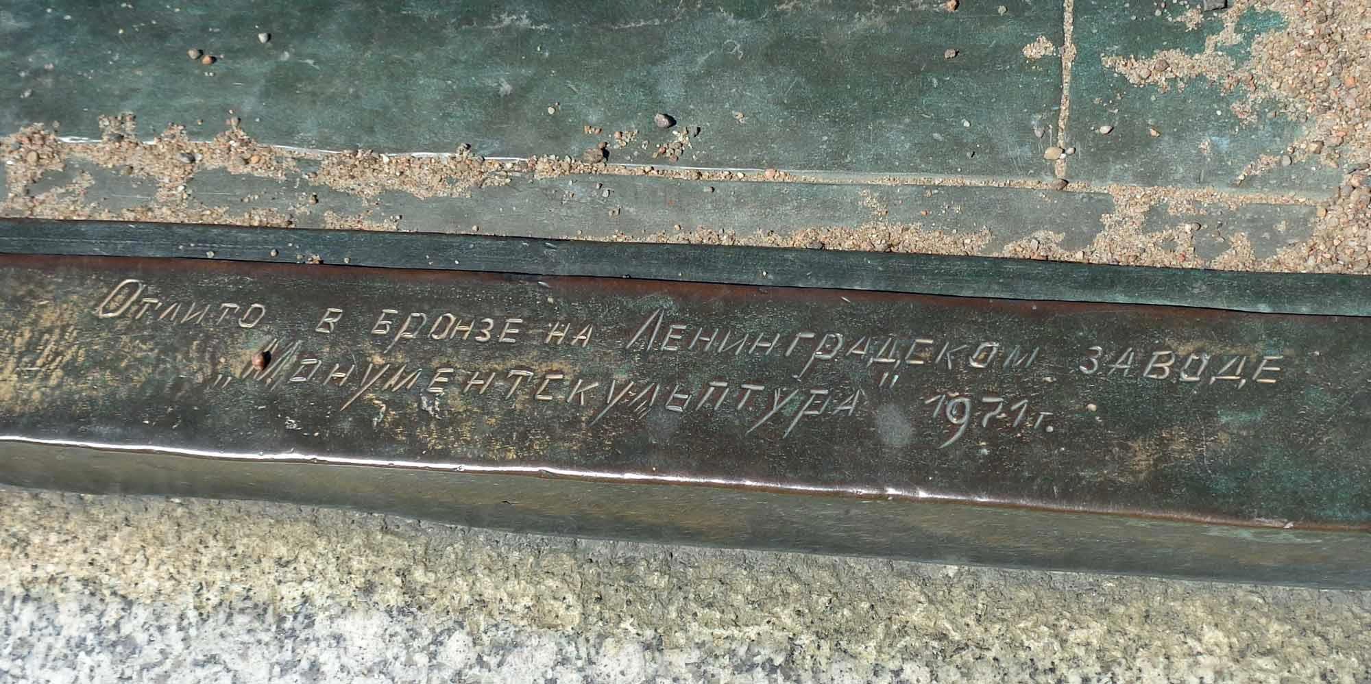 Мастера Ленинградского завода Монументскульптура не забыли оставить свою "роспись" в нижнем правом углу бронзовой плиты, поставив дату "1971 год":