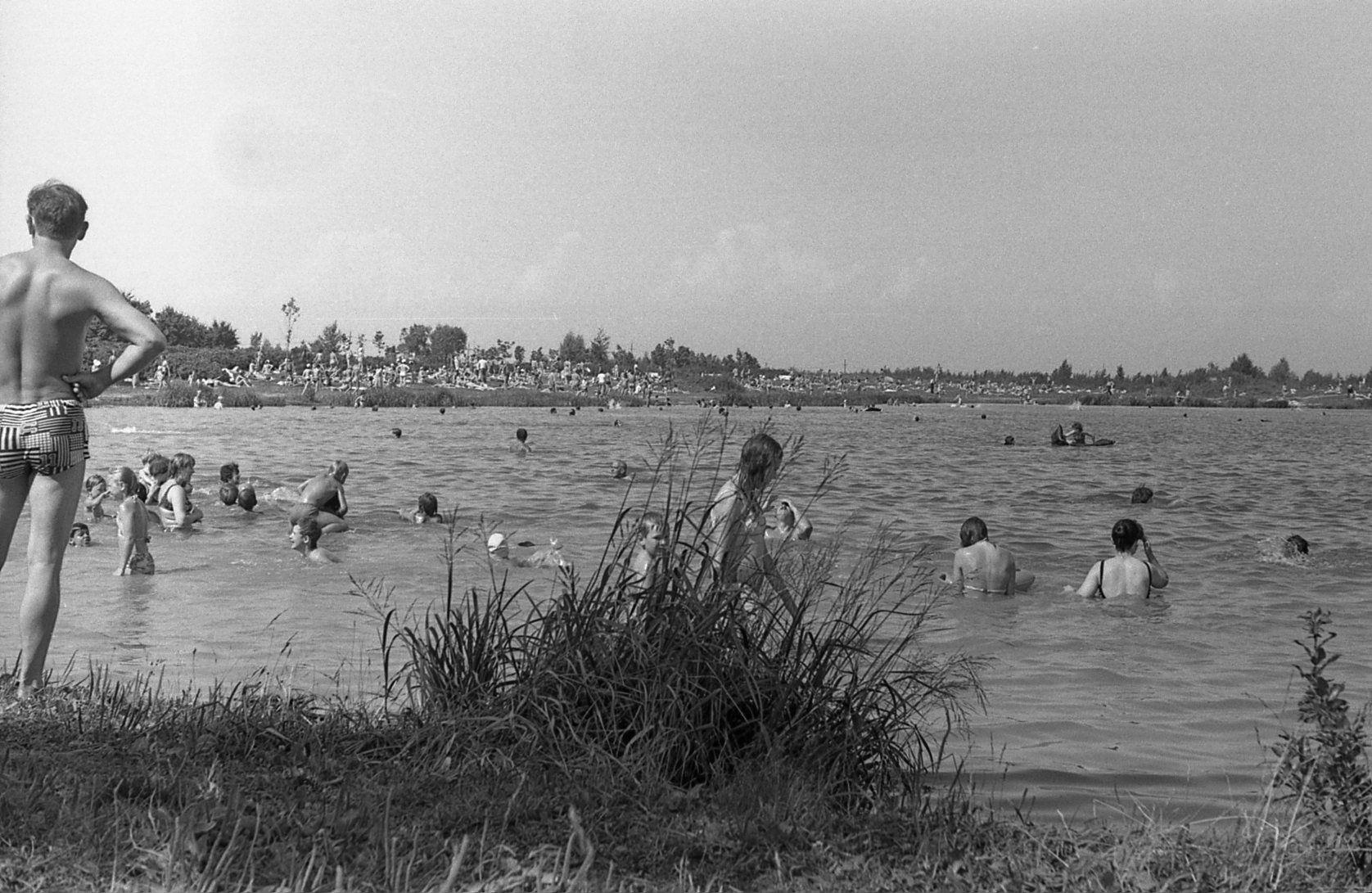 На Восьмёрке купались, хотя в ней ужасное глинистое дно. Идти по нему нужно осторожно, чтобы не подскользнуться. Ноги вязнут по щиколотки и кажется, что сейчас тебя схватит за пятку какой-нибудь водяной из холодных, чавкающих глубин. Обратите внимание, берега просто усыпаны желающими окунуться. Воскресный день в парке (фото 1974 года, из архива автора):