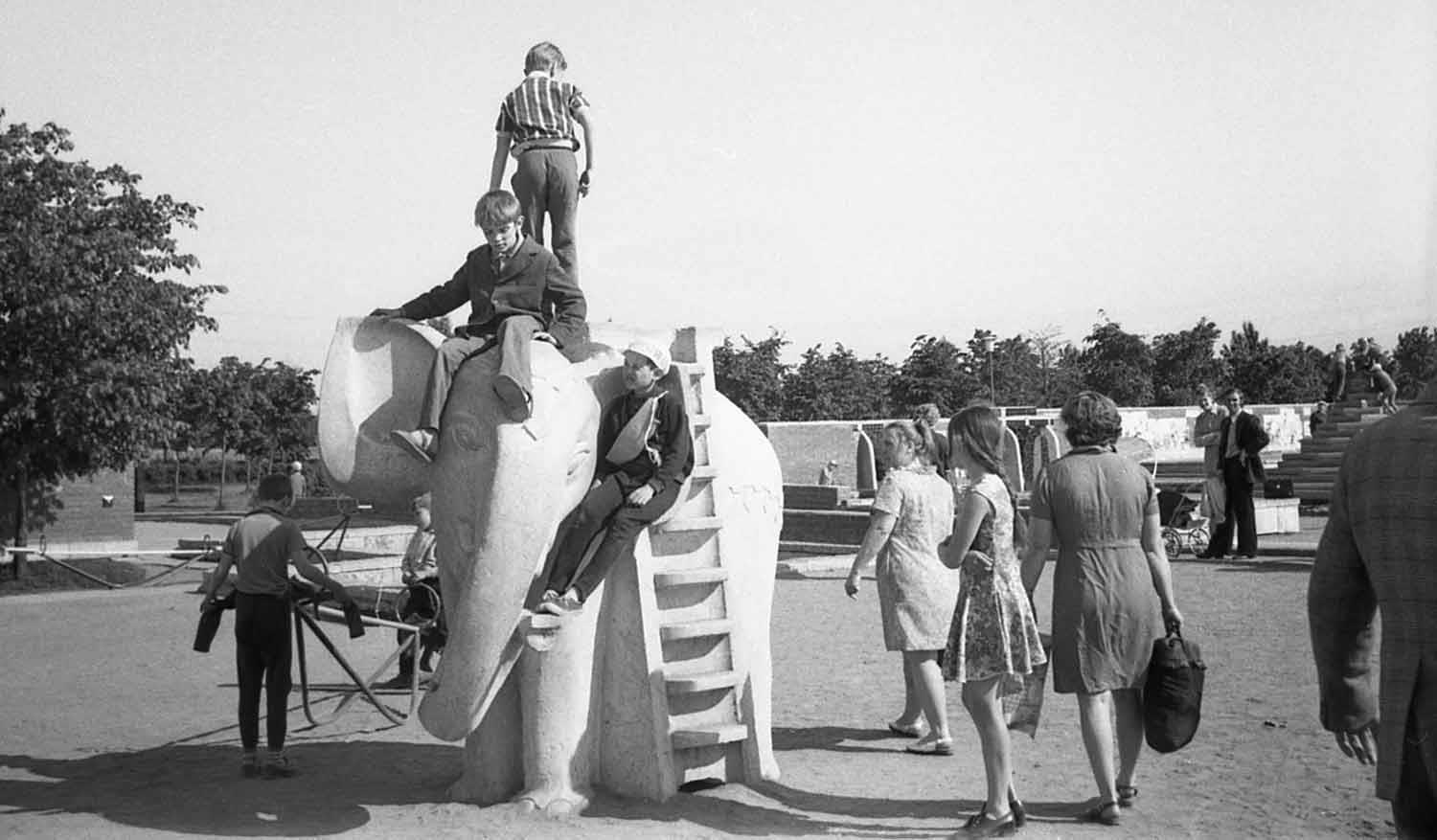 Фигура слона на площадке детского городка. Если не ошибаюсь, справа от него, в платьице с длинными волосами - это я (фото 1974 года):