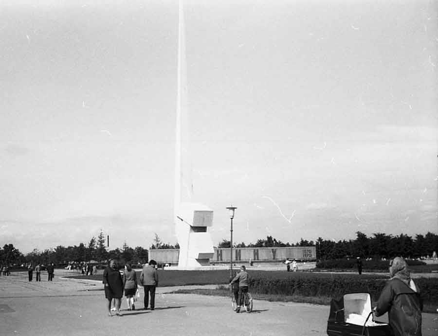 В 1999 году наконец-то взорвали уродский монумент на входе в парк, который в народе называли "Штык и молот". Официально там был серп, но на серп нифига не похоже. Теперь на входе виднеется кораблик с алыми парусами. Пожалуй, он больше подходит для парка отдыха. На фото: монумент "Серп и молот", фотография 1973 года из архива автора: