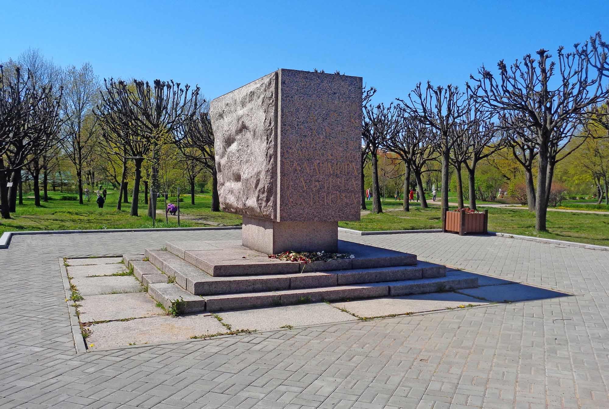 Остался на своём месте другой странный монумент, посвящённый Ленину: большой кусок грубо обтёсанного гранита с едва заметной надписью. Стоит себе на пригорке, окружённый агрессивными деревьями: