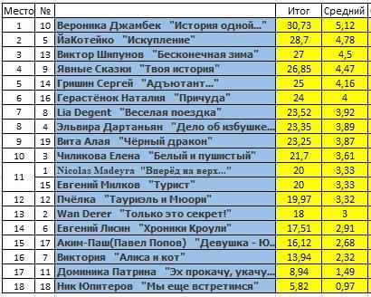 | Второе место, опередив Виктора Шипунова, всего на 0,28 балла занимает.... ЙаКотейко с рассказом Искупление Поздравляю!!! | ![]() |