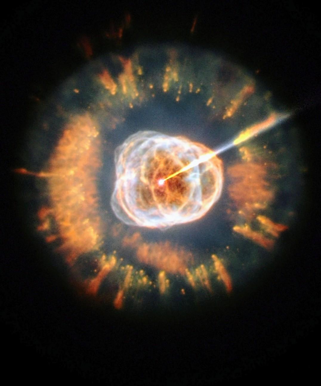 Примерно в 5000 световых годах от Земли потрясающая туманность NGC 2392 образовалась после гибели звезды, подобной нашему Солнцу.При этом ультразвуковом сканировании изображение сканируется по часовой стрелке, как радар. Радиус сопоставляется с высотой тона, поэтому свет, находящийся дальше от центра, имеет более высокую высоту тона. Очертания оболочки туманности можно услышать в нарастании и падении высоты тона, подчеркиваемых ее спицами. Яркость управляет громкостью.