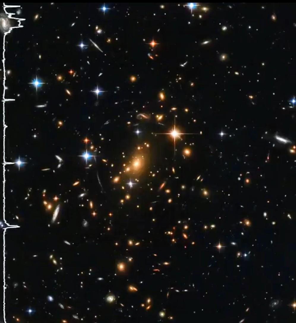 Космос становится “звуковым” в этой визуализации скопления галактик, изображенного Хабблом. Время течет слева направо, а частота звука меняется снизу вверх, варьируясь от 30 до 1000 Герц. Объекты в нижней части изображения создают более низкие ноты, в то время как объекты в верхней части создают более высокие ноты. Большинство видимых пятен - это галактики, в которых находится бесчисленное множество звезд. Несколько отдельных звезд ярко сияют на переднем плане. Звезды и компактные галактики создают короткие, четкие тона, в то время как растянутые спиральные галактики издают более длинные ноты, которые меняют высоту тона. Более высокая плотность галактик вблизи центра изображения — сердца этого скопления галактик, известного как RXC J0142.9+4438 — приводит к появлению тонов среднего диапазона в середине видео. Усовершенствованная камера Хаббла для съемок и широкоугольная камера 3 получили это изображение 13 августа 2018 года.