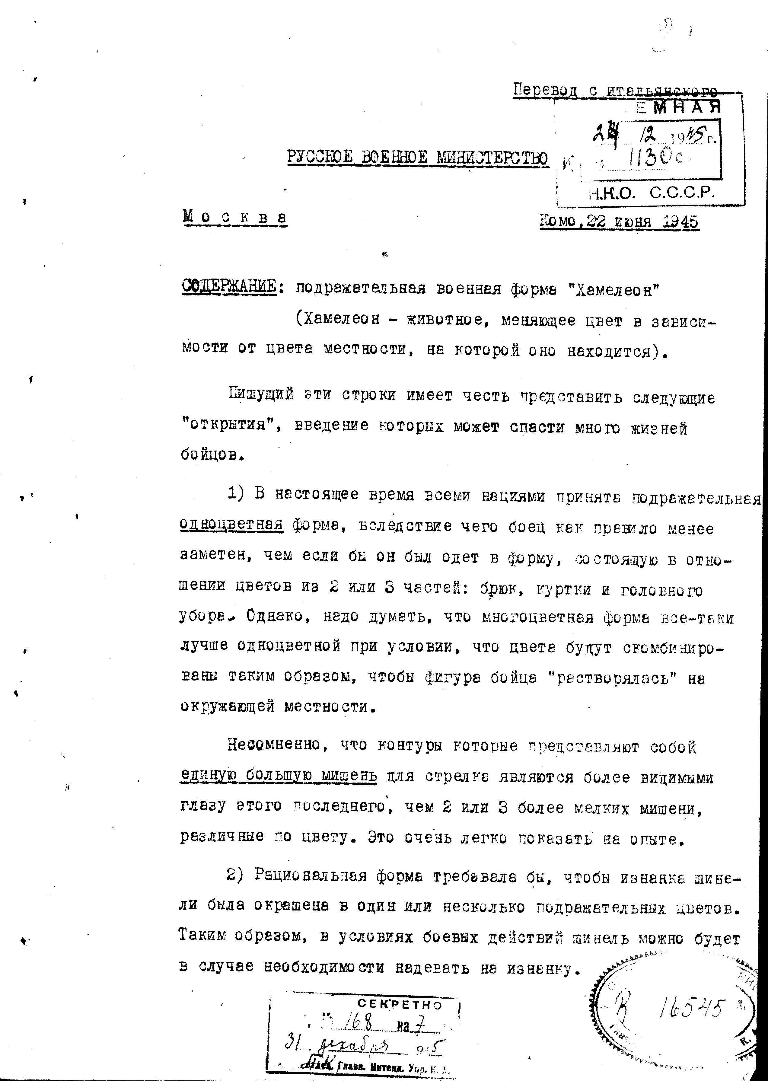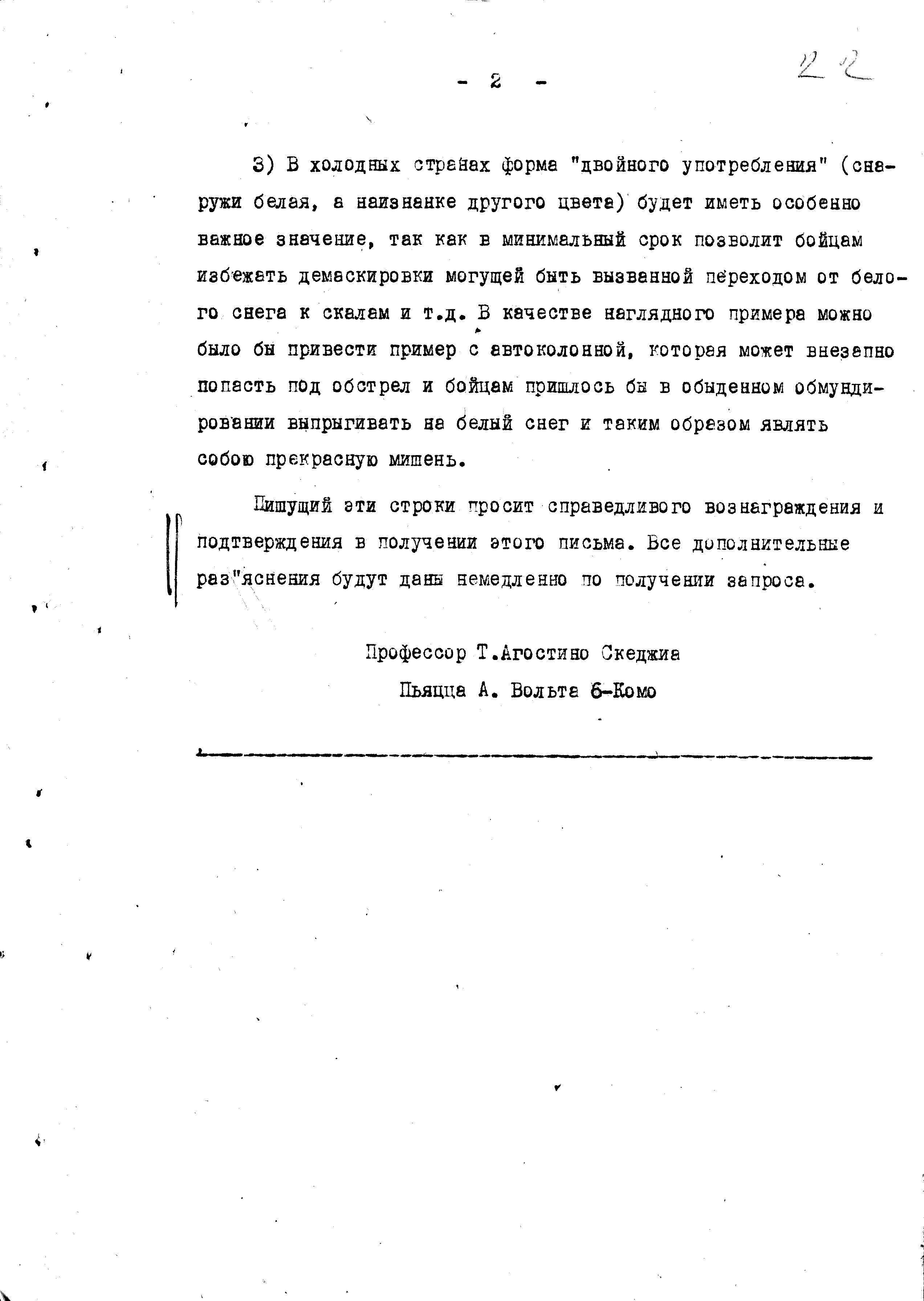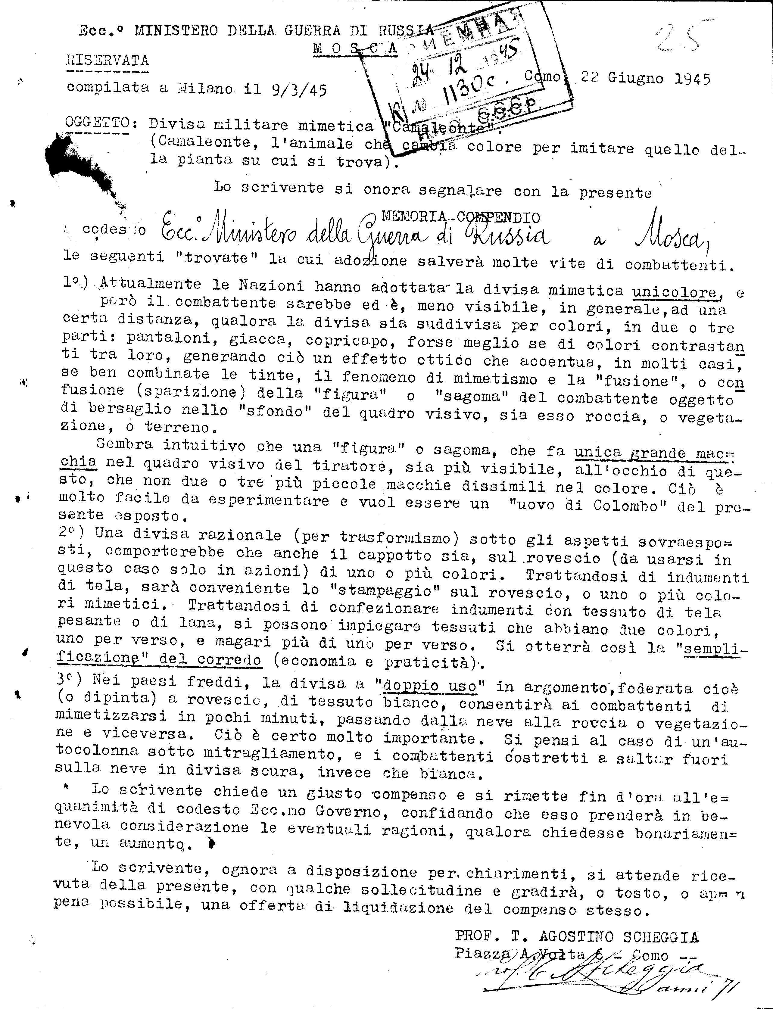 д/с: письмо профессора Т. Агостино Скеджиа по разработке подражательной военной формы «Хамелеон»