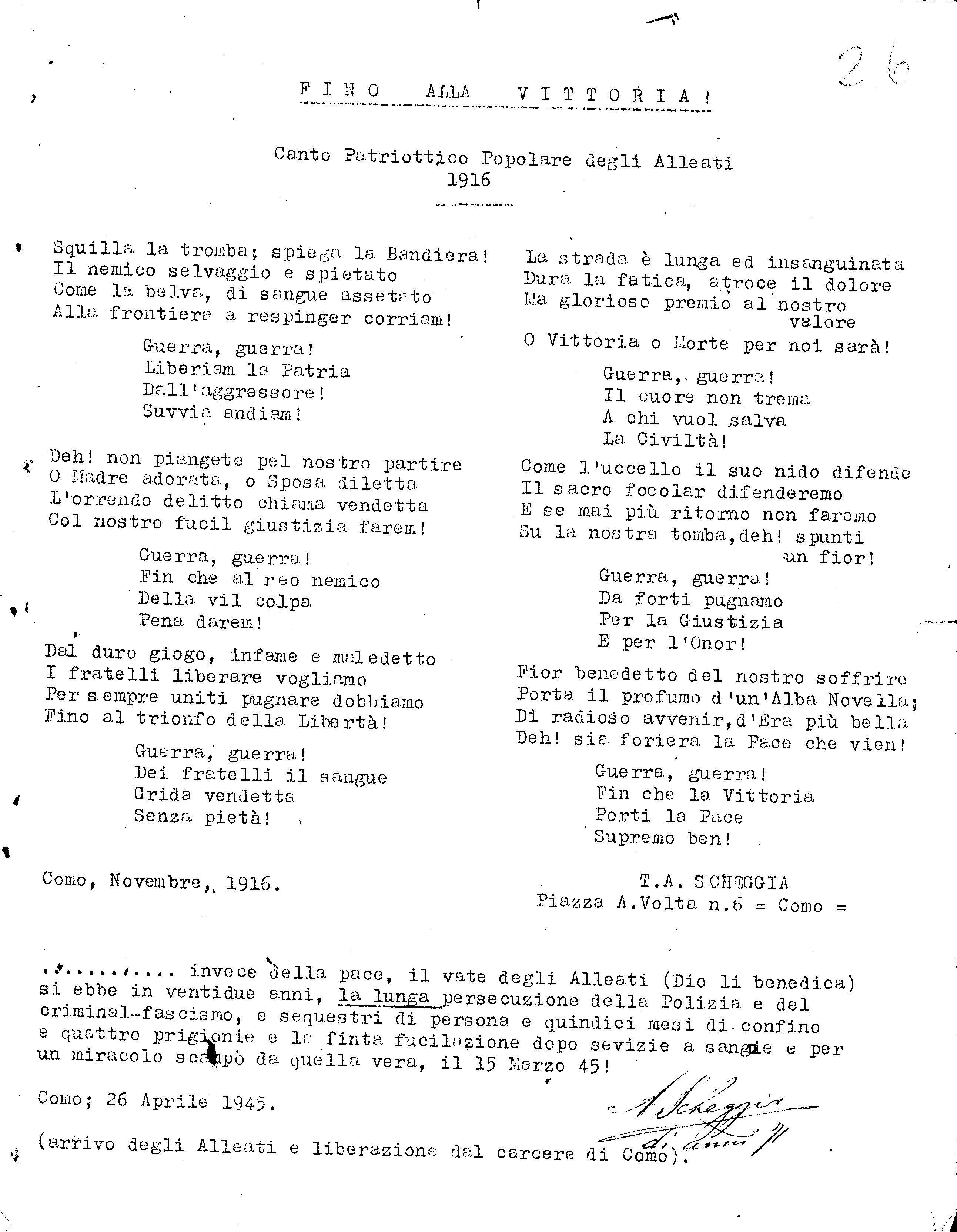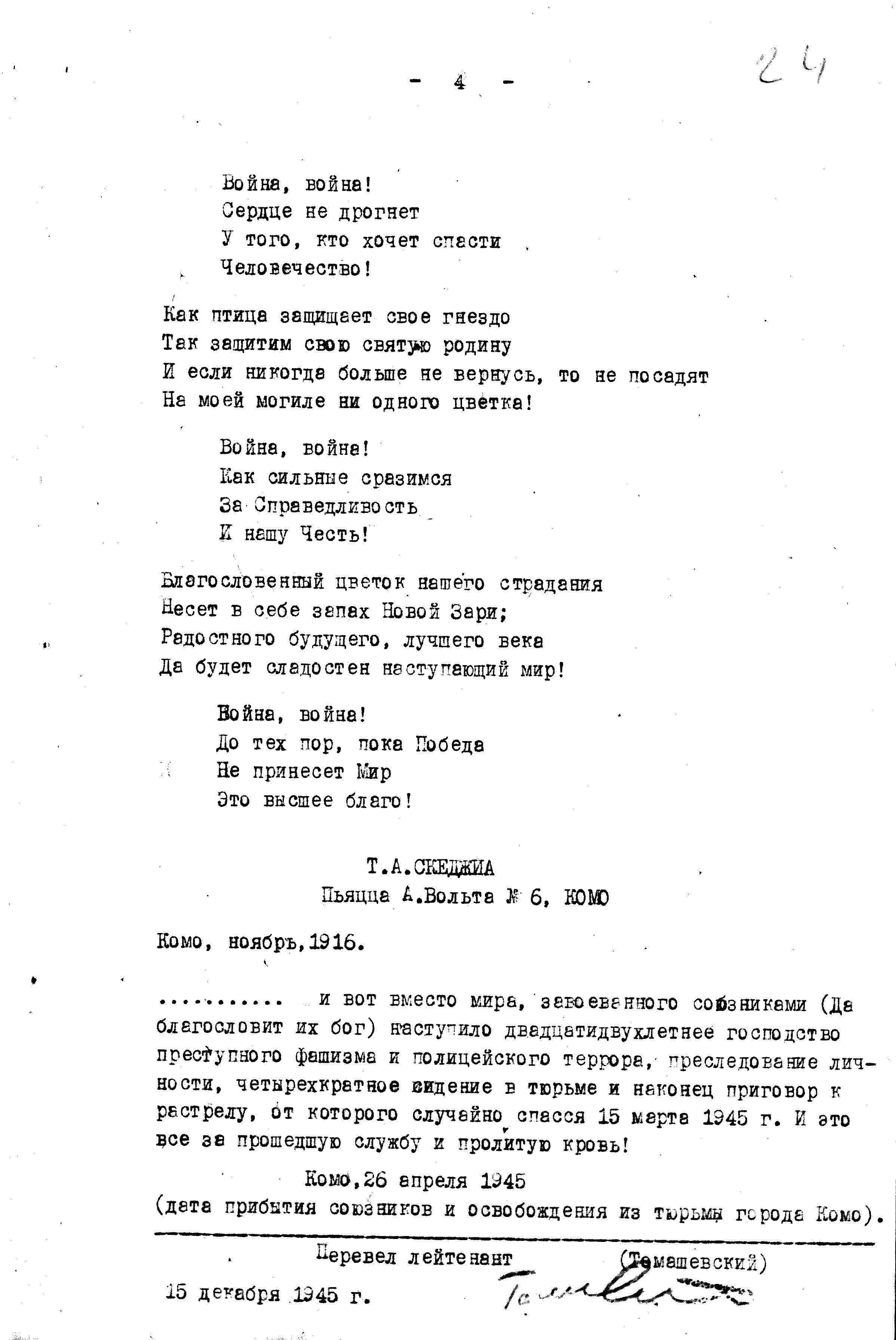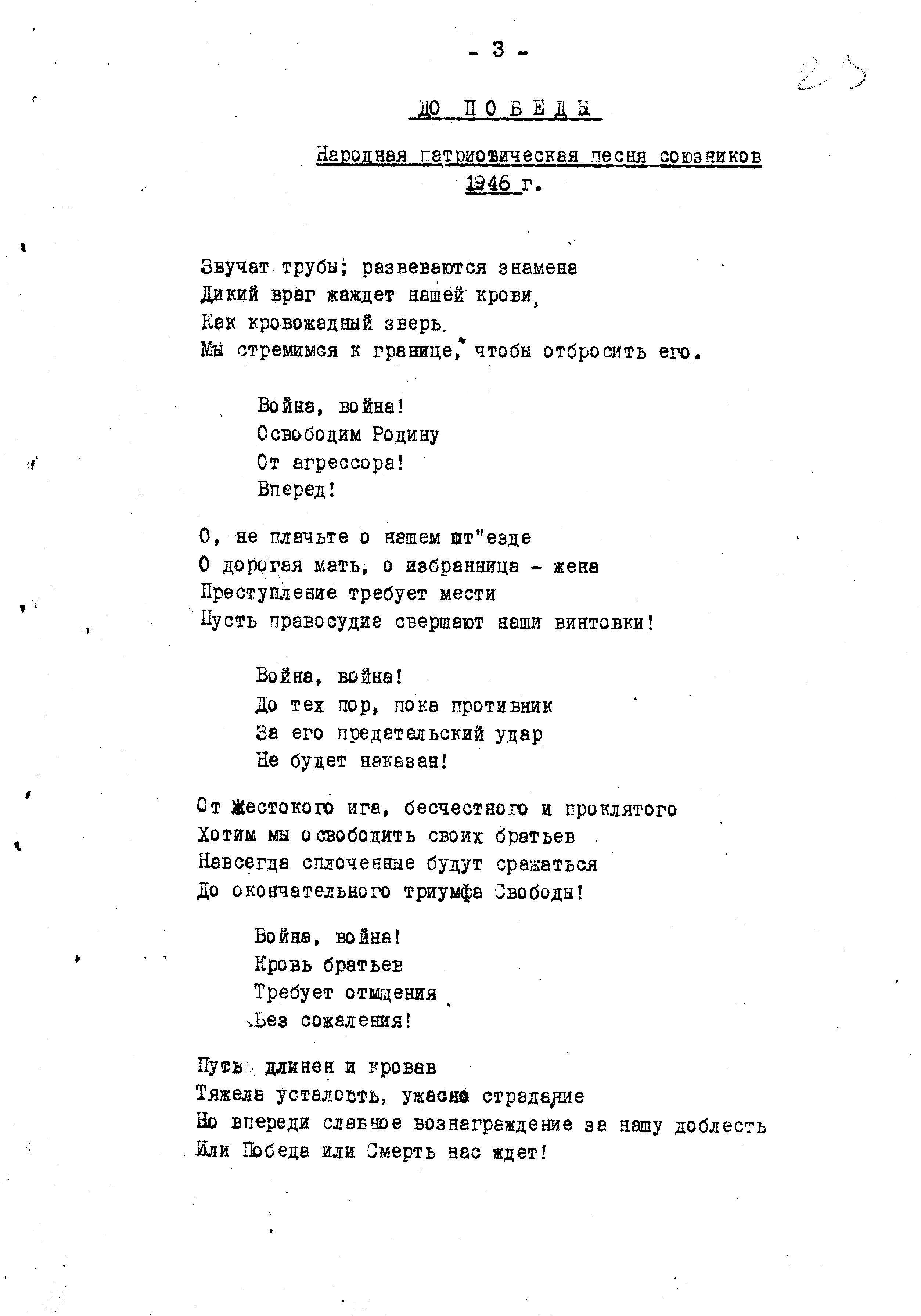 Автор зачем-то приложил к письму ещё и слова народной патриотической песни союзников. Правда, в перевод песни похоже закралась ошибка, год создания песни «До Победы» не 1946, а 1916 г. В этом можно убедиться, если прочитать оригинал письма: