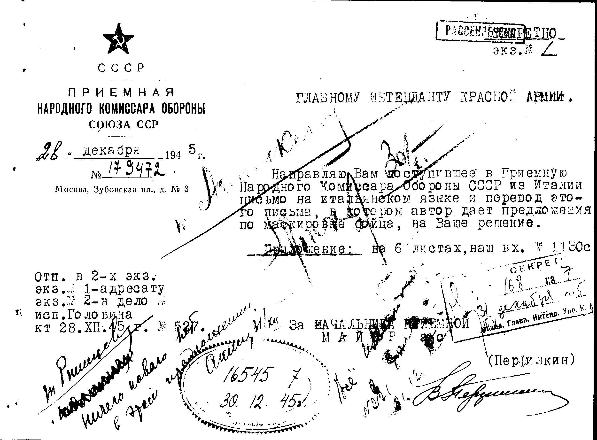 д/с: Письмо из приёмной Наркома обороны СССР с резолюциями руководителей ГИнтУ