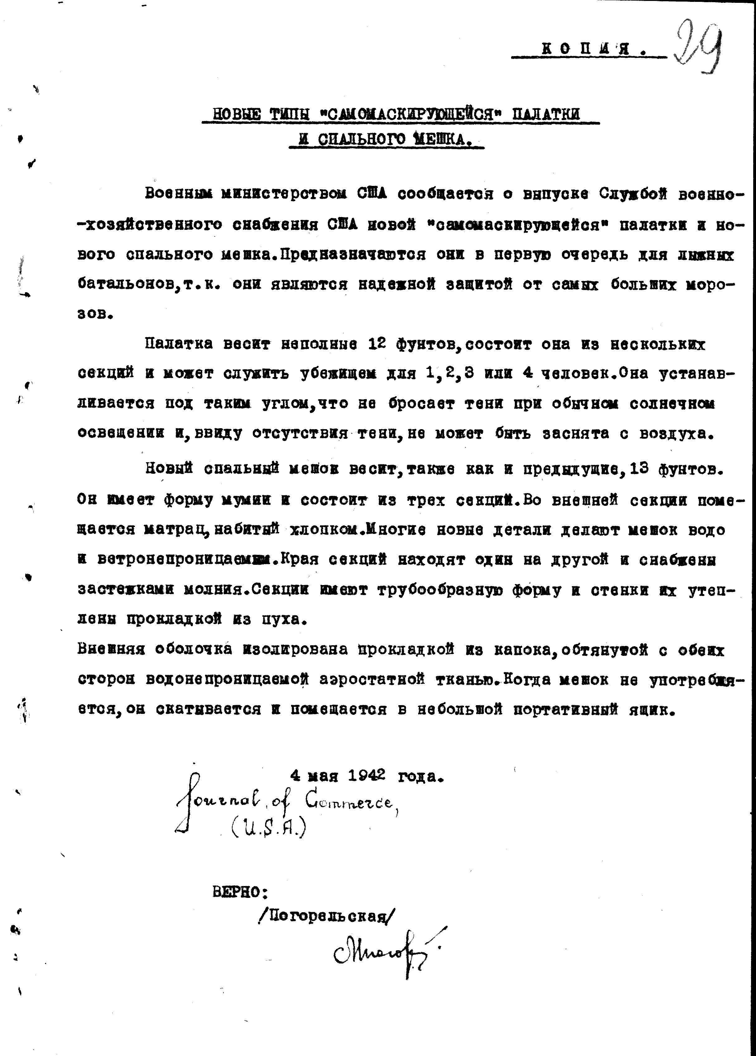 д/с: Новые типы «самомаскирующейся» палатки и спального мешка. Статья из Journal of Cjmmerce, 1942 г.![]()