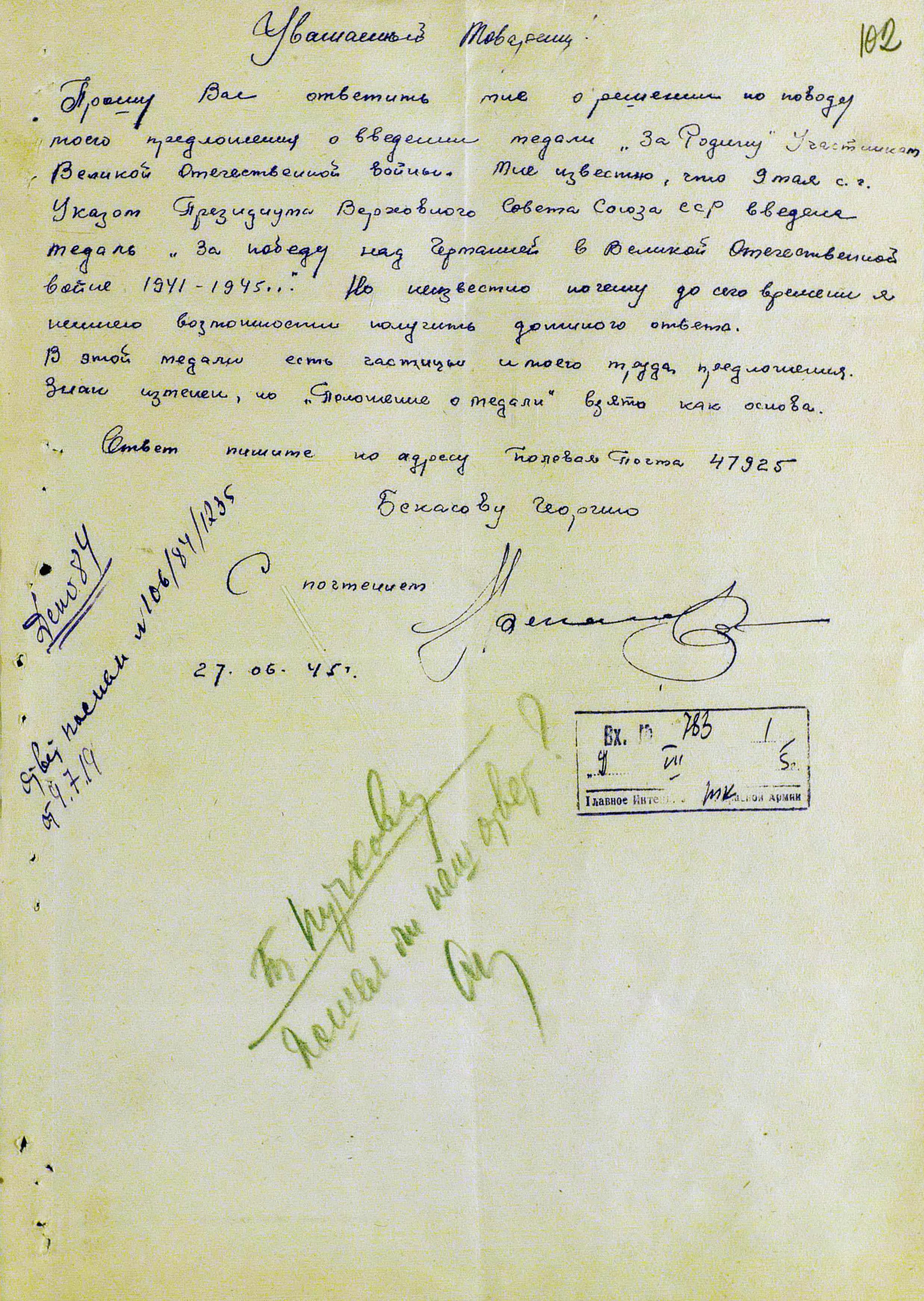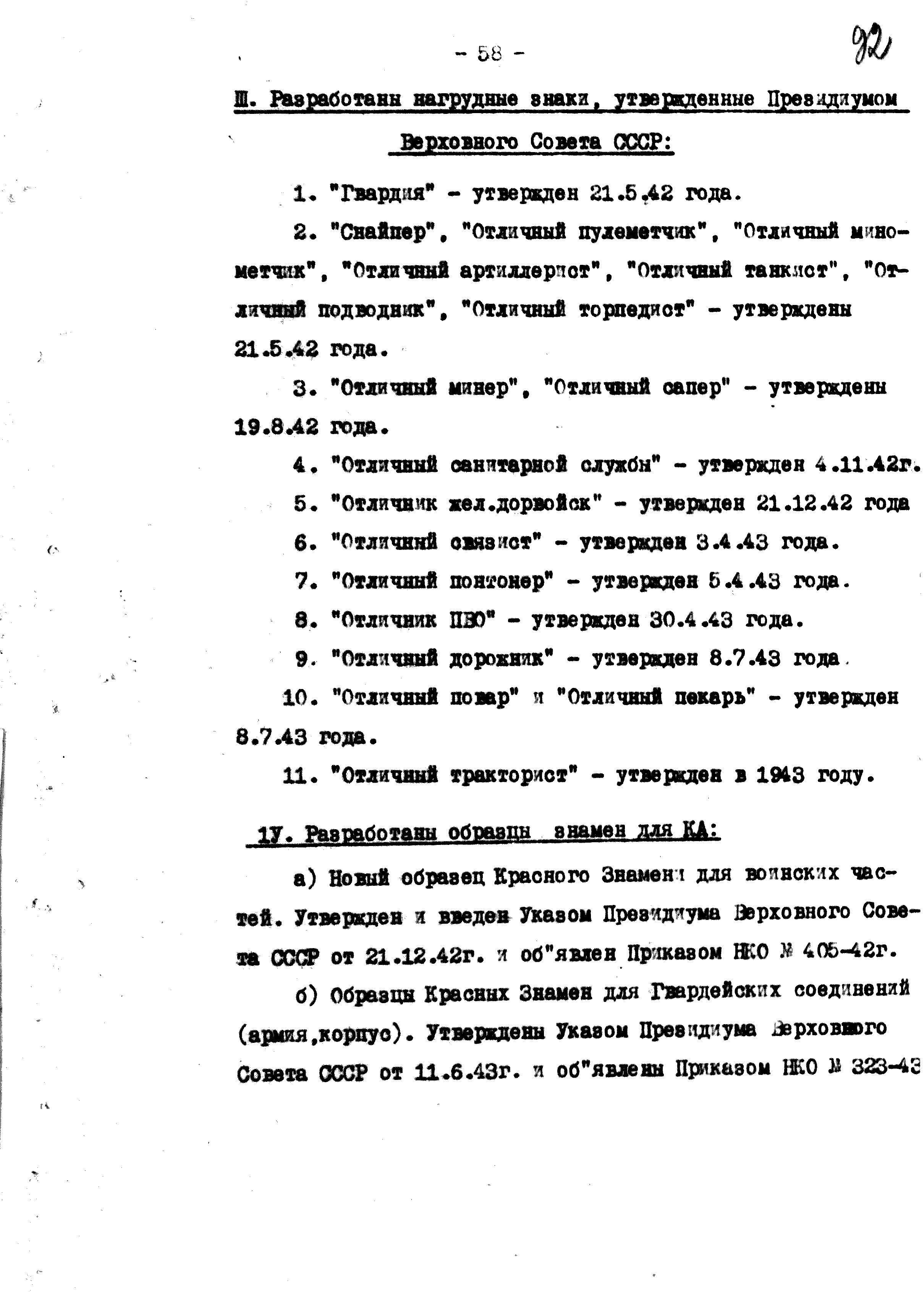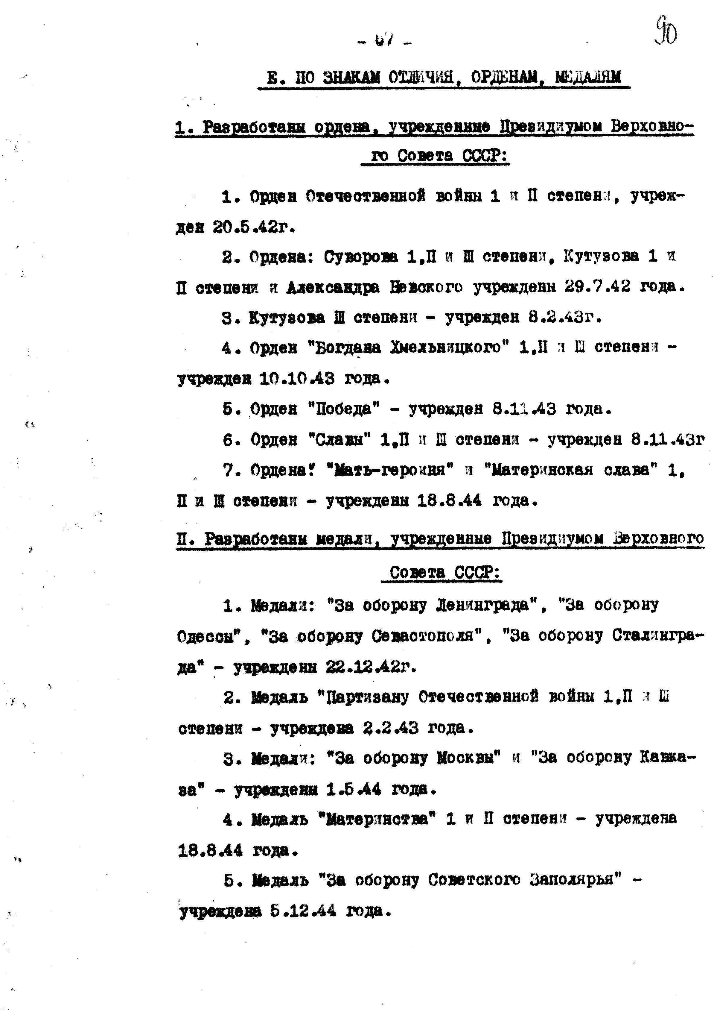 Крайне мало информации по разработке наград. Впечатление, что все предварительные материалы и большая часть переписки по этой теме сданы в какой-то другой архив. К сожалению, это раздел крайне скуден, содержащуюся в нём информацию можно найти за несколько минут поиска в интернете. И очень жаль, так как это было единственное подразделения в стране, занимавшееся разработкой всех наград СССР, от разработки эскиза и статута награды, до представления готовой награды на утверждение Верховному Главнокомандующему.