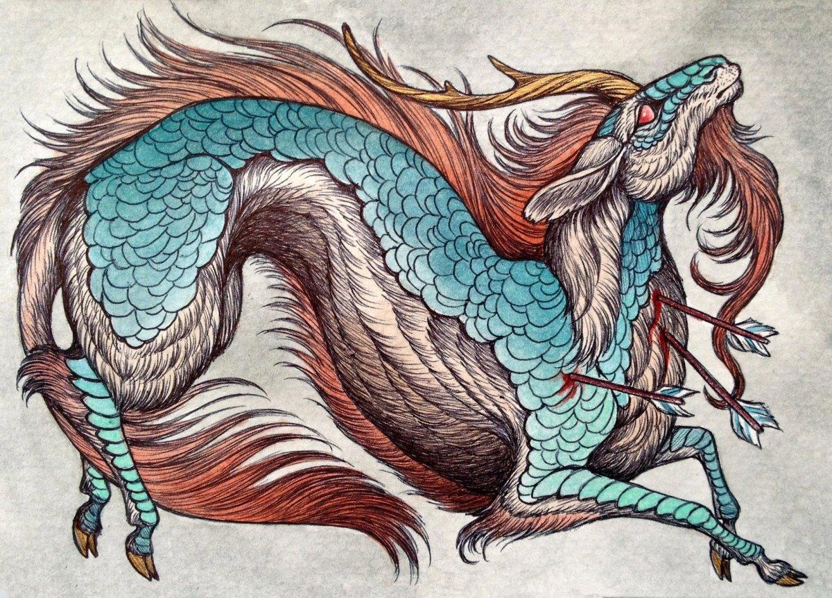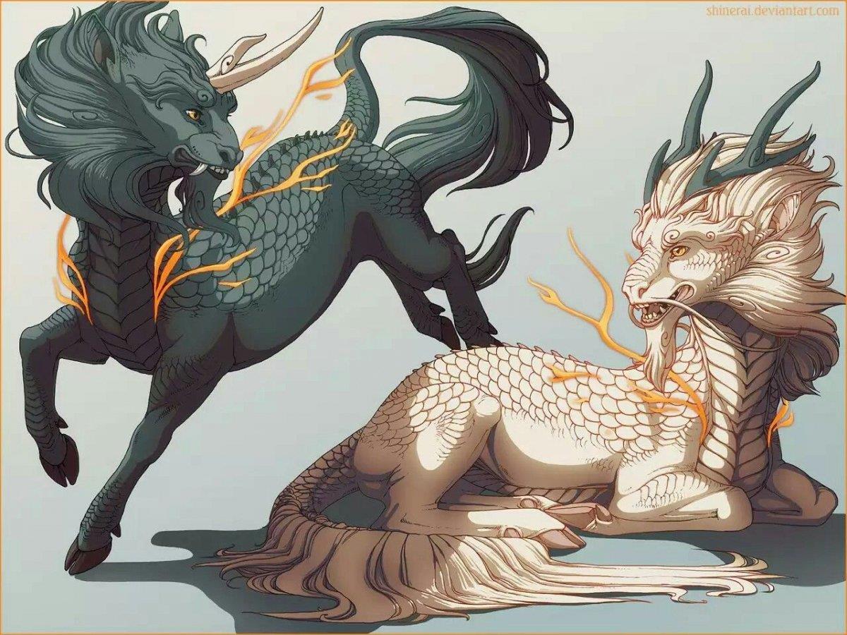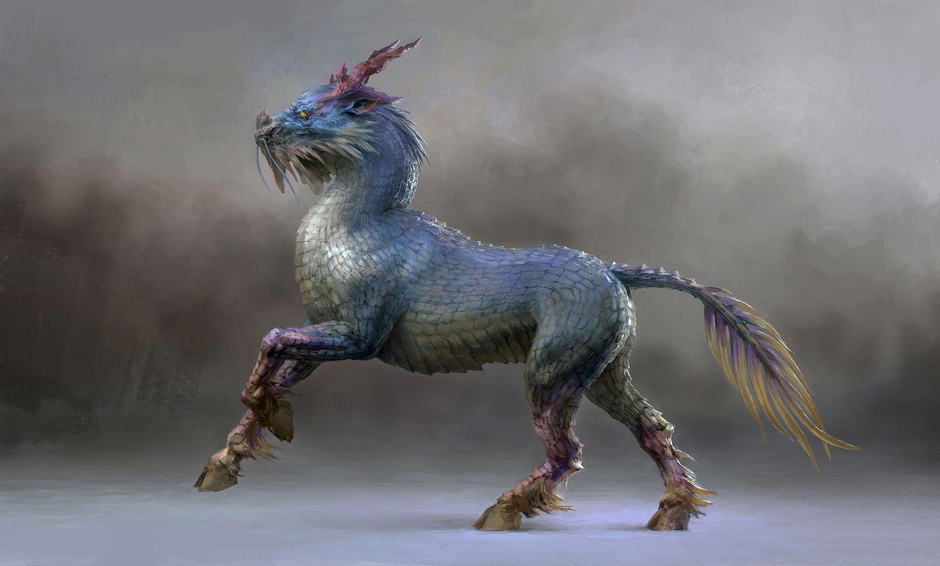 Это создание отдаленно было похоже на единорога. По крайней мере, общие очертания и копыта лошадиные, и по центру лба - один извилистый рог. А в остальном оно напоминало дракона - почти такая же клыкастая морда с длинными усами и мощное, покрытое чешуей тело. Чешуя была белой с перламутровым отливом, а грива, усы и длинная пышная кисточка на хвосте - светло-голубыми.