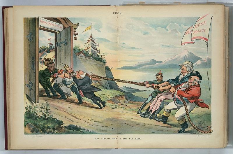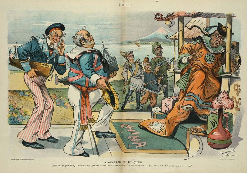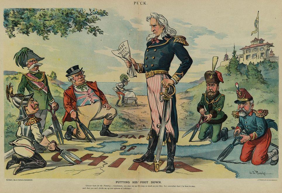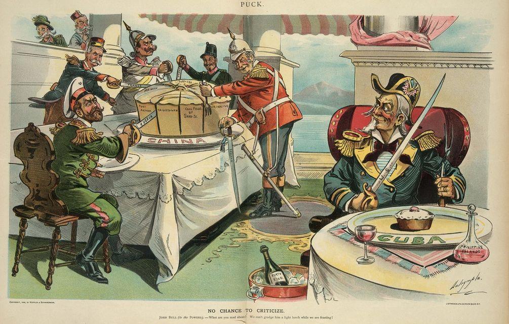 (Дядя Сэм разгромив испанский флот прибрал к рукам испанские колонии - в частности Кубу. Хотя война была как бы спровоцирована как бы испанцами, как бы взорвавшими броненосец "Мэн", но США должно было обелить себя - и потому раздел Китая выставляется куда более страшным хищничеством, чем разгром Испании.)