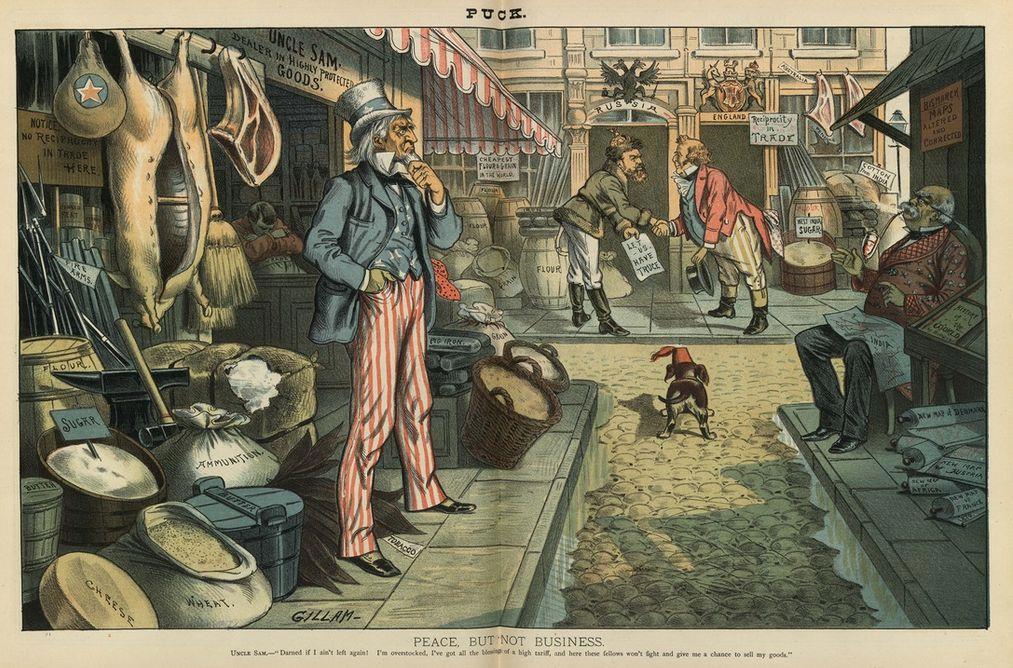 Следующая вещь, которую надо сделать. На стене, где стоит дядя Сэм, написано "запретительные тарифы"