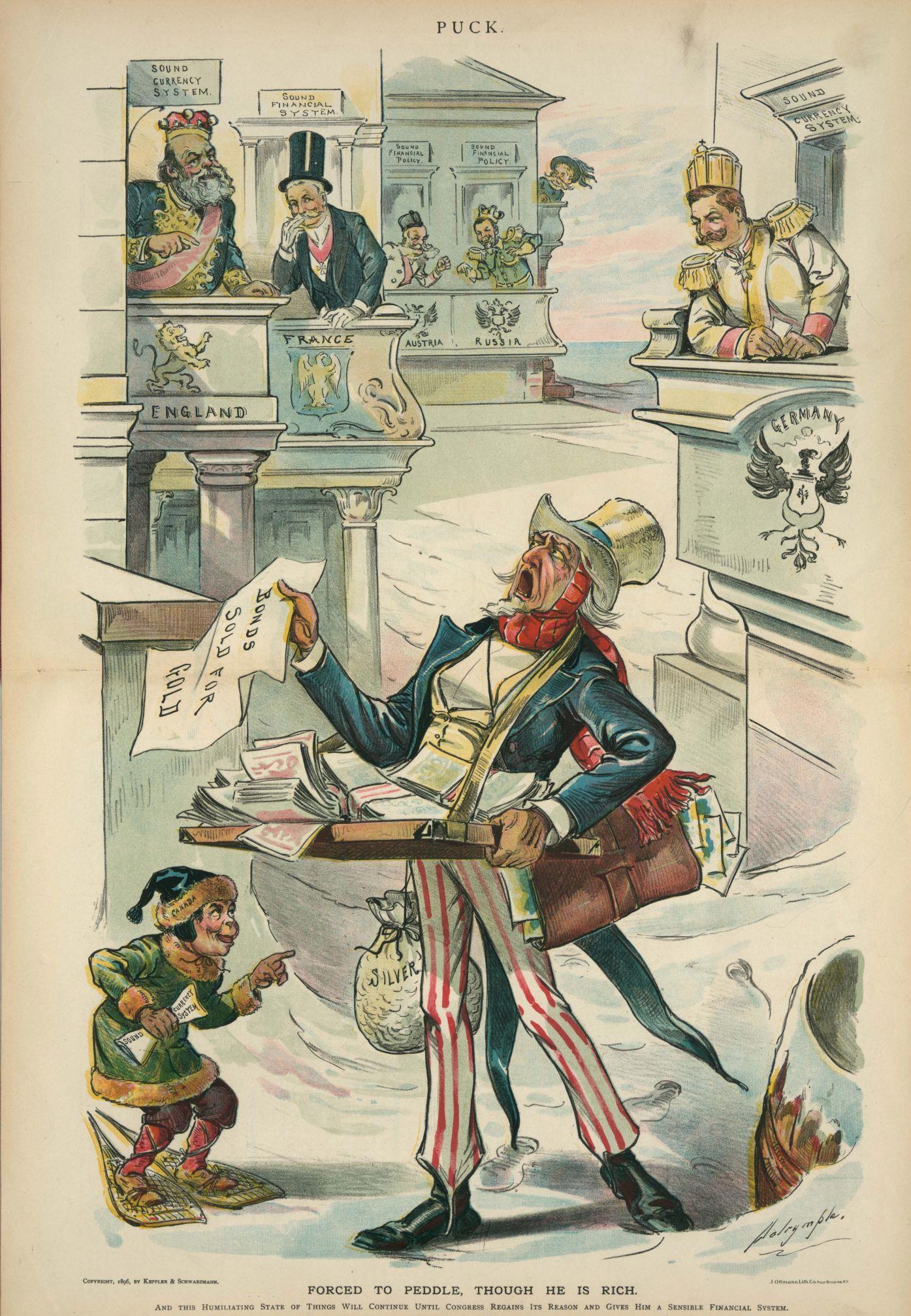 1896 г. Над каждым главой государства написано "Прочная валютная система". Дядя Сэм ходит с табличкой "Продам бонды за золото". Подпись под карикатурой - "Вынужден торговать вразнос, несмотря на то, что богатый. Эта унизительная ситуация будет продолжаться до тех пор, пока конгресс не создаст разумную финансовую систему
