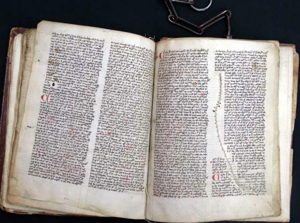 Самая старая рукописная книга ― Сочинения Альберта Великого (на пергамене) XIV века. О ней я уже рассказывала. Она ко всему прочему еще и со шрамом (видите, зашитая страница? Пергамент штука дорогая, так что средневековые переписчики не стали выкидывать испорченный лист, а аккуратно его зашили). И вот такими цепями книги приковывали к полкам. Для сохранности. Добавлю еще, что книга очень тяжелая.