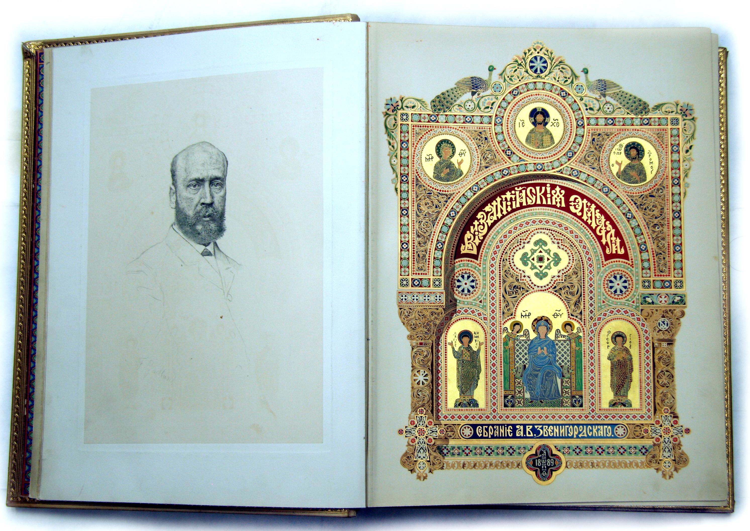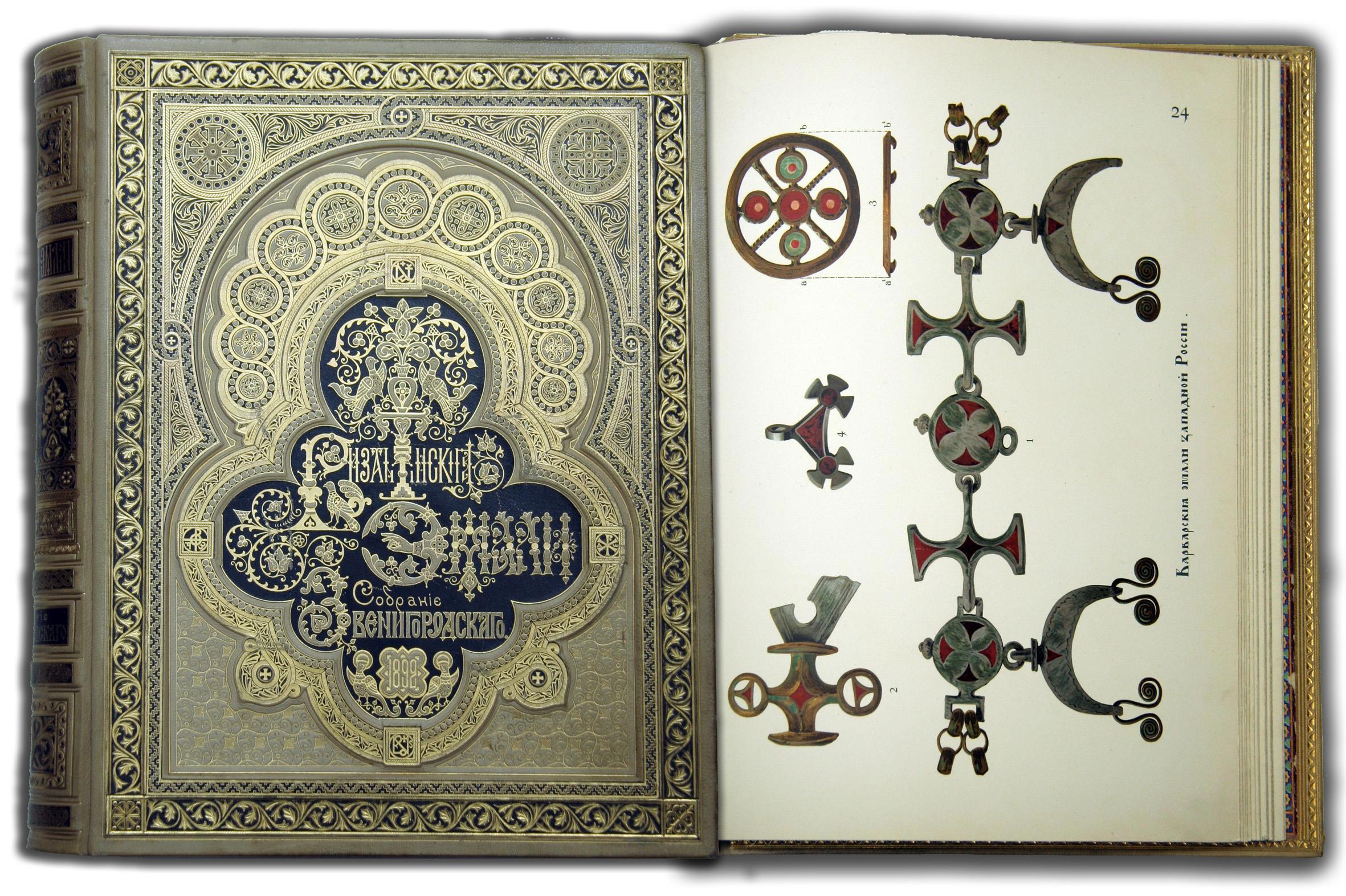Книга в самом дорогом переплете (шагрень, конгревное и золотое тиснение, орнаментированный форзац) ― Кондаков Н.П. История и памятники византийской эмали (С-Петербург, 1892).