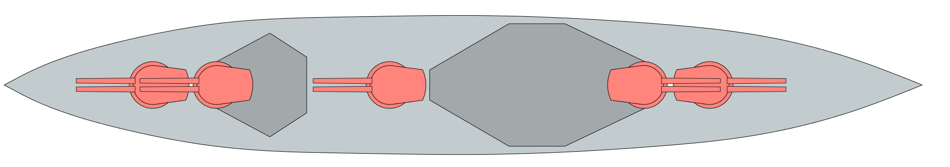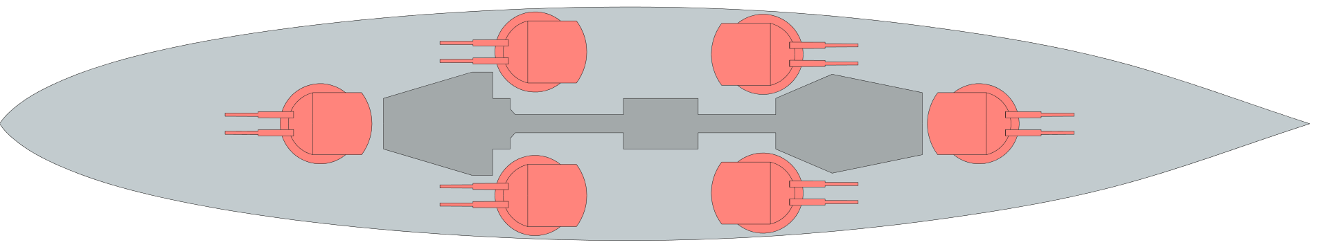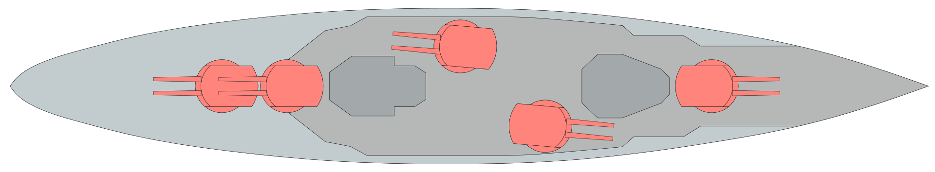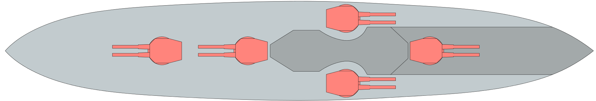 наконец, пример линейно-возвышенного расположения башен, все орудия могут вести огонь на оба борта