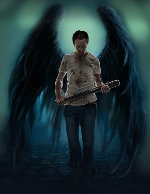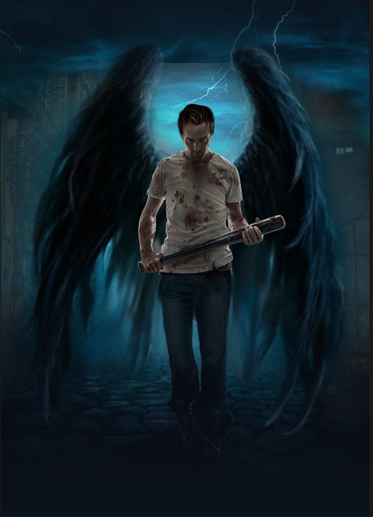 Не мудрствуя лукаво, я вбил в Яндекс "мрачный мужик с крыльями" и выбрал вариант в моих любимых мрачно-синих тонах.