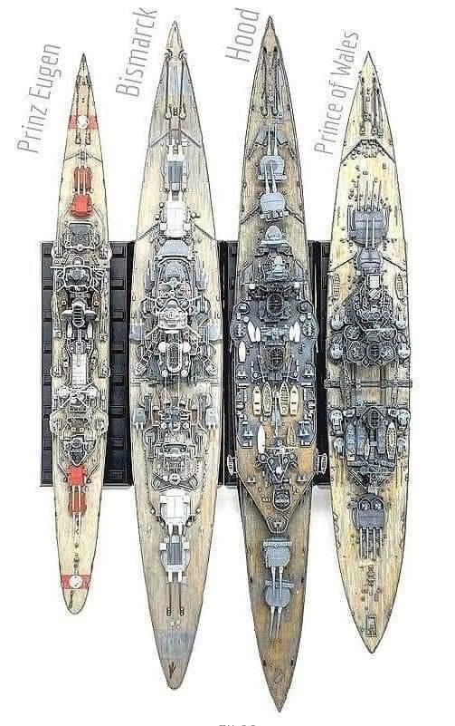 Дата эта уже позади, но всё же: попалась мне тут одна интересная картинка, которая любителям военно-морской истории не может не быть интересной. На ней изображены модели (вид сверху) основных участников битвы в Датском проливе, которая, как я уже сказал, произошла 24 мая 1941 года. Картинка эта предоставляется вашему вниманию: