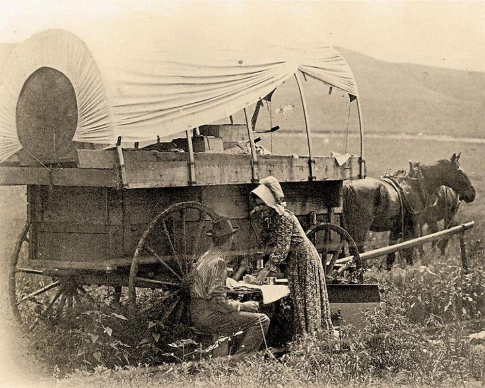 На этой фотографии Дикого Запада запечатлены несколько эмигрантов, остановившихся пообедать рядом со своим фургоном. Есть большая вероятность, что они поселились лишь на короткое время, прежде чем снова отправиться в путь. Они могли путешествовать неделями, останавливаясь только для того, чтобы поесть, поспать и дать своим лошадям отдохнуть и восстановиться.