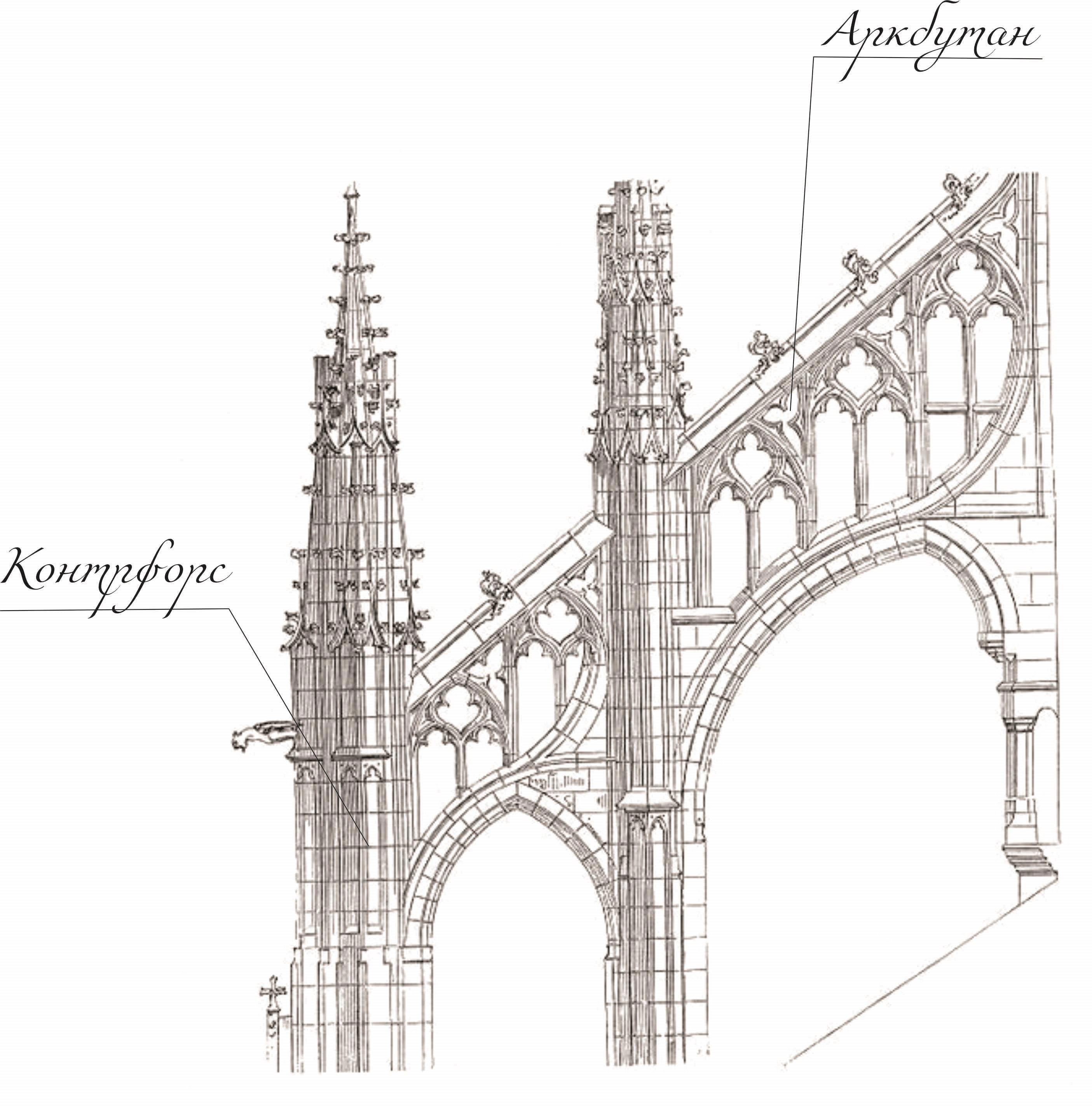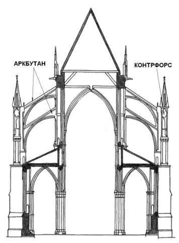 В готической архитектуре контрфорс часто уже не примыкает к несущей стене, а соединен с ней аркбутаном.