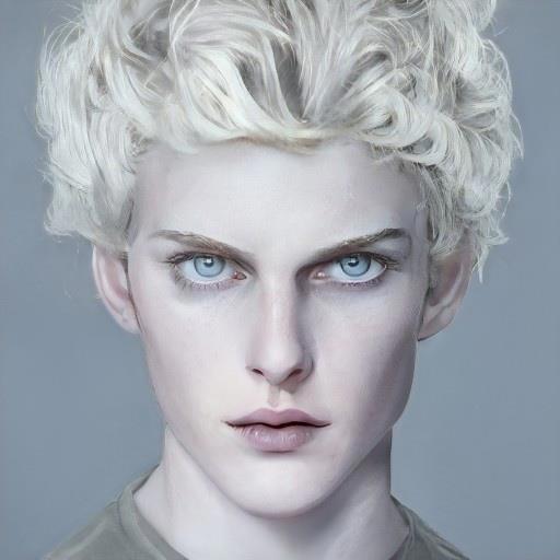 "Белые волосы нежными кудрями окаймляли высокий лоб, пухлые розовые губы казались ярким пятном на бледном лице юноши, а его большие миндалевидные серые глаза, обрамленные пышными светлыми ресницами, смотрели прямо и открыто".