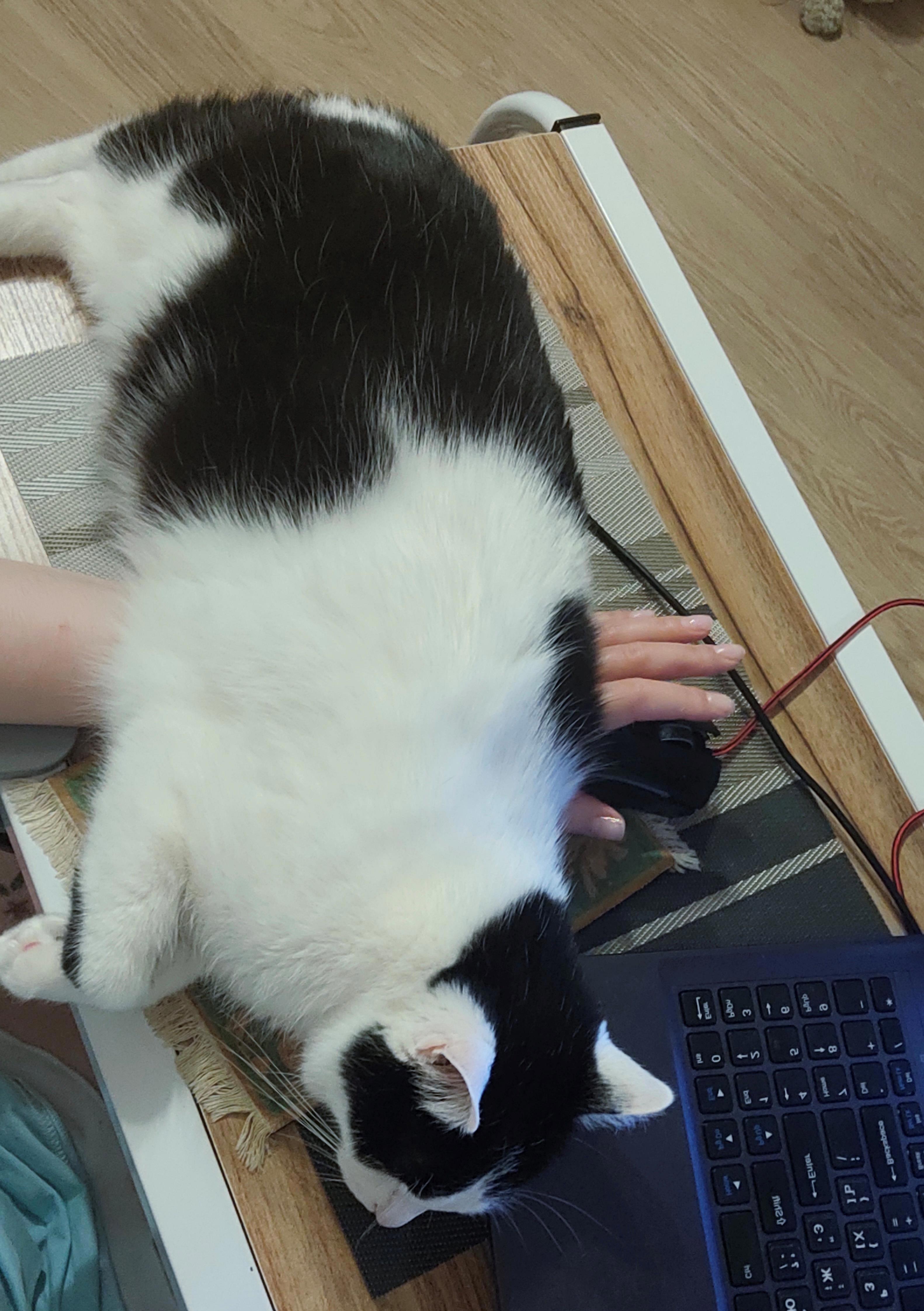 Активно мешает мне писать книгу, ибо монотонное поглаживание по инерции его не устраивает: "Давай, двуногая, не халтурь! Я знаю, что твои конечности способны на большее".