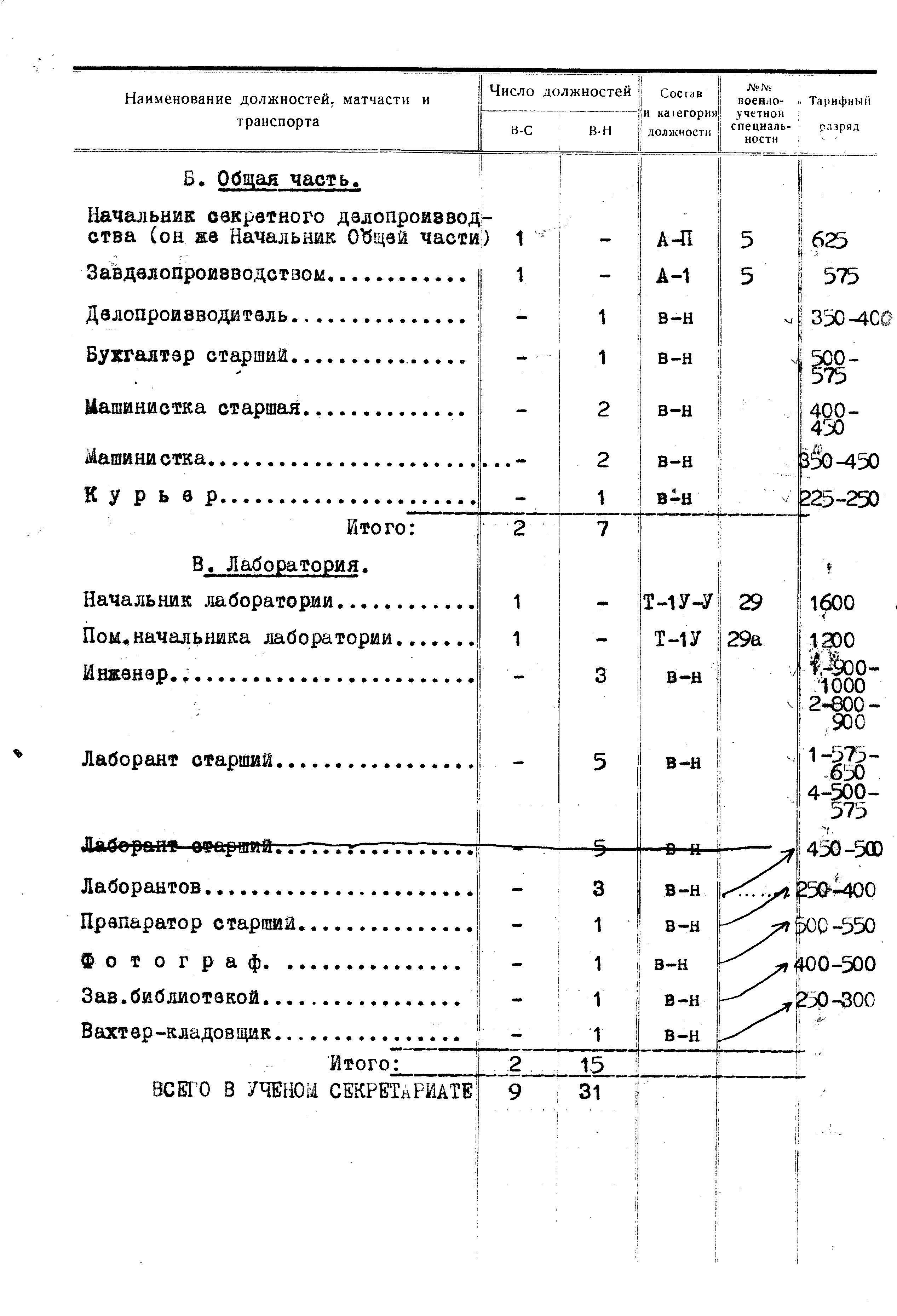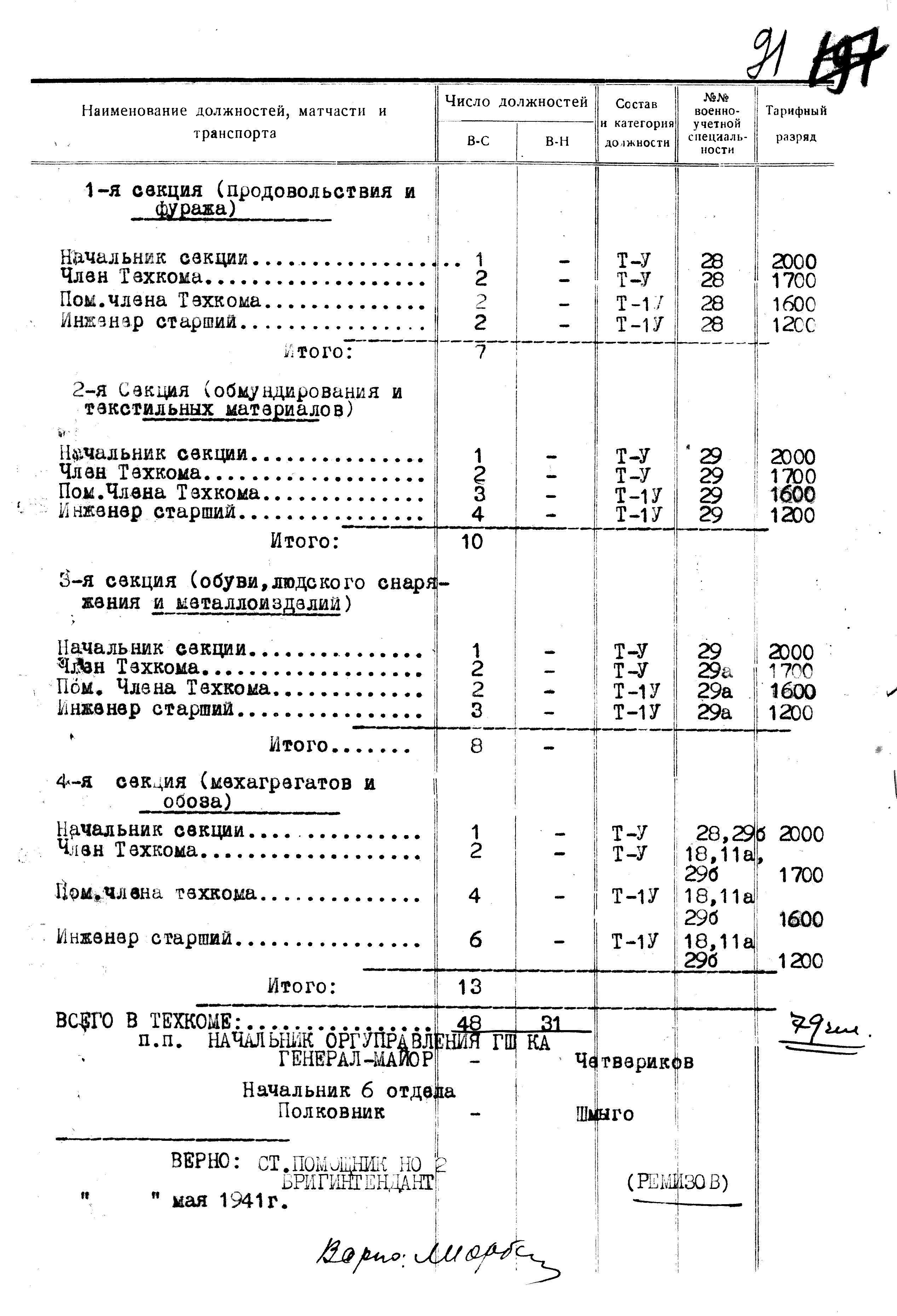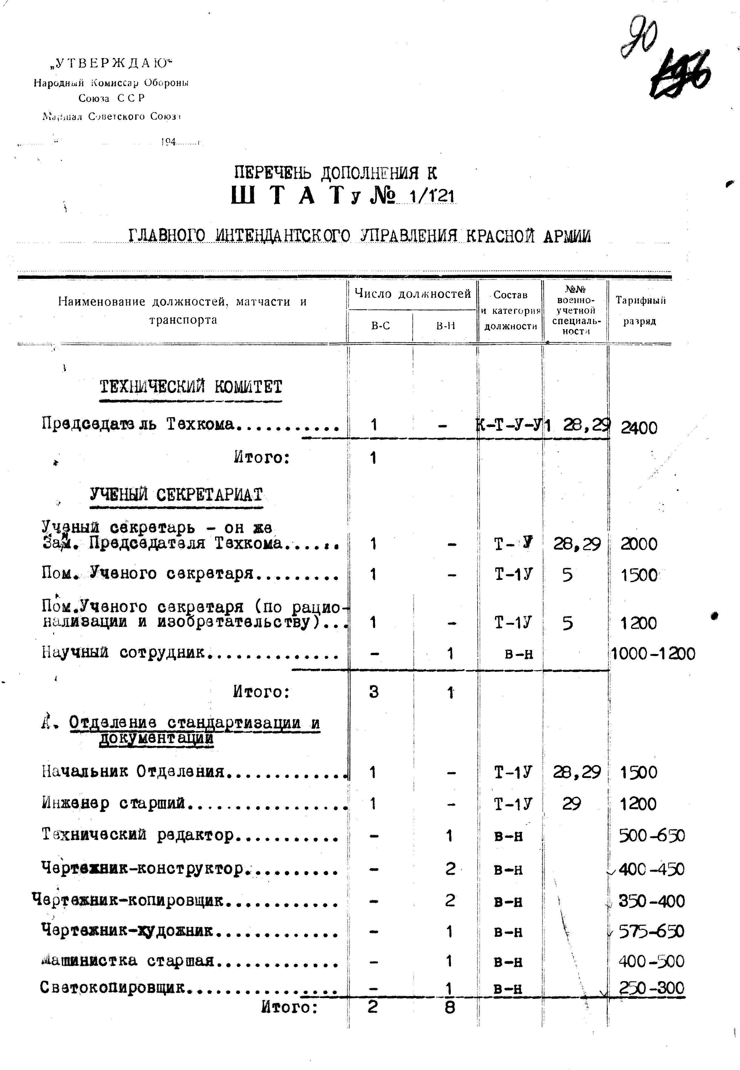 д/с: Штат Технического Комитета Главного Интендантского Управления Красной Армии по состоянию на май 1941 г.