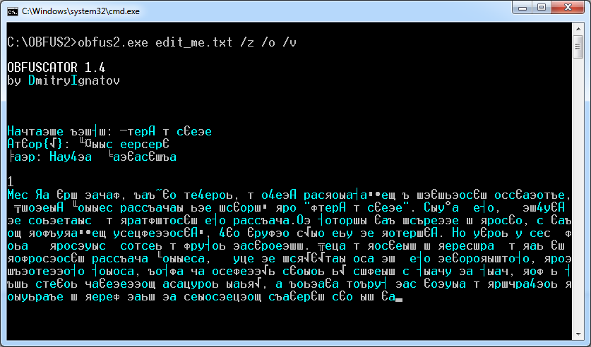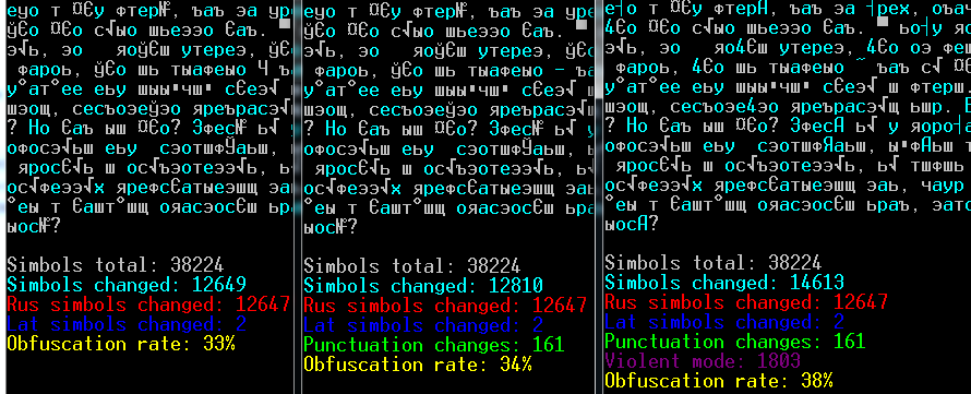/v – жестокий режим – некоторые буквы меняются на спецсимволы. Изменения визуально заметны, но глаз «привыкает» их читать. Обфускация повышается до 38-40%