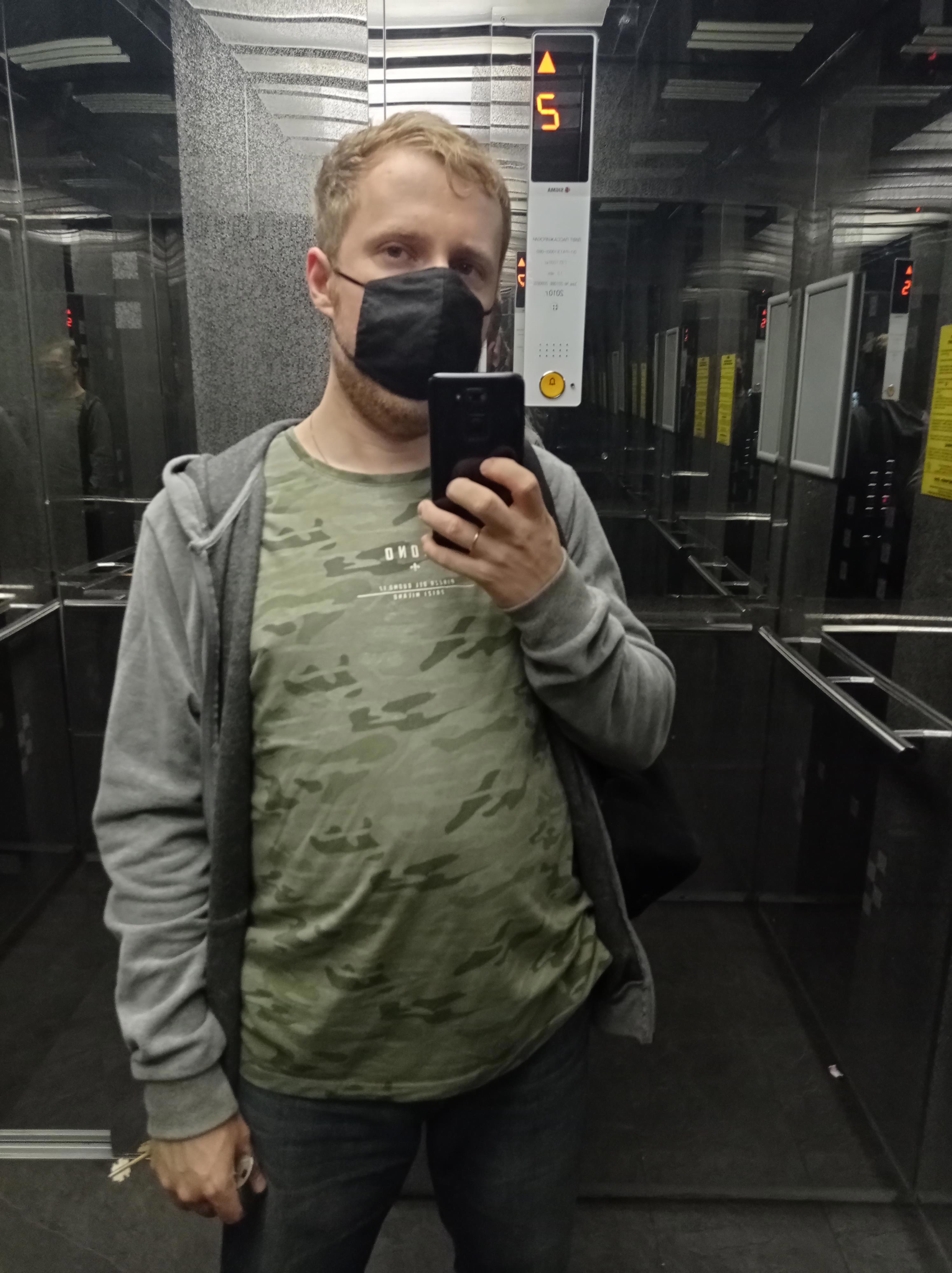 Это уже в корону, на работе, весна 2021, кажется. Как видите, за время самоизоляции пузяку наел весьма. Сейчас пытаюсь сбросить килограммов 5, а лучше б даже 10.