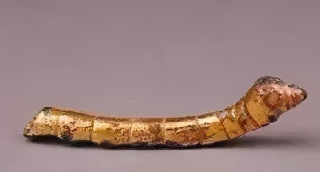 Это довольно большая фигурка гусеницы, на внешней стороне сохранились остатки медного покрытия. Ее тело разделено на девять сегментов, включая голову. Восемь пар ножек, соединенных с брюшной частью, полностью сохранны. Гусеница имеет округлые формы и кажется довольно упитанной, а ее положение говорит о том, что в этот момент она возможно выделяет нить для завивки кокона.